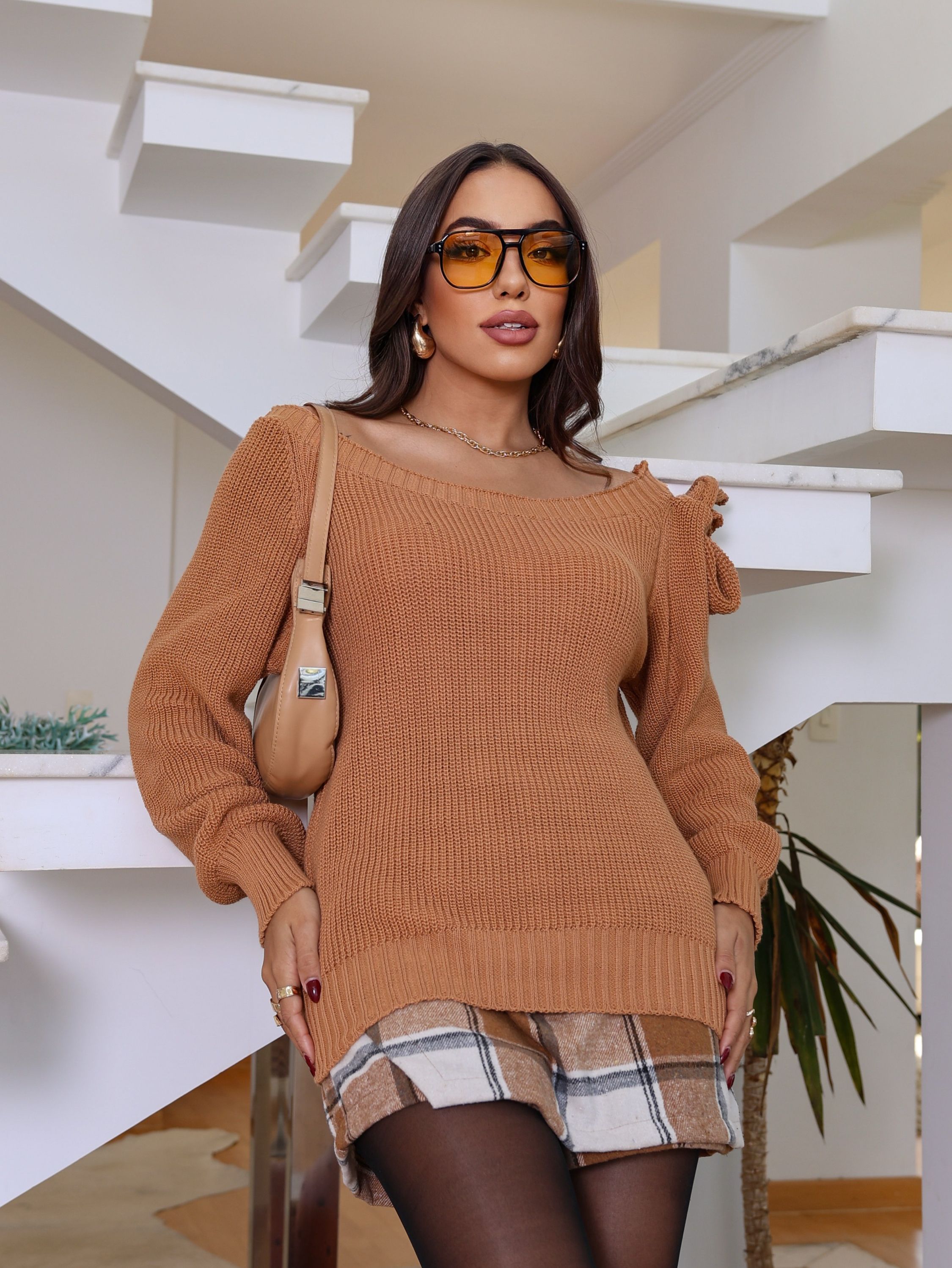 Blusa tricot Feminino Manga Longa Inverno Com Laço No Ombro
