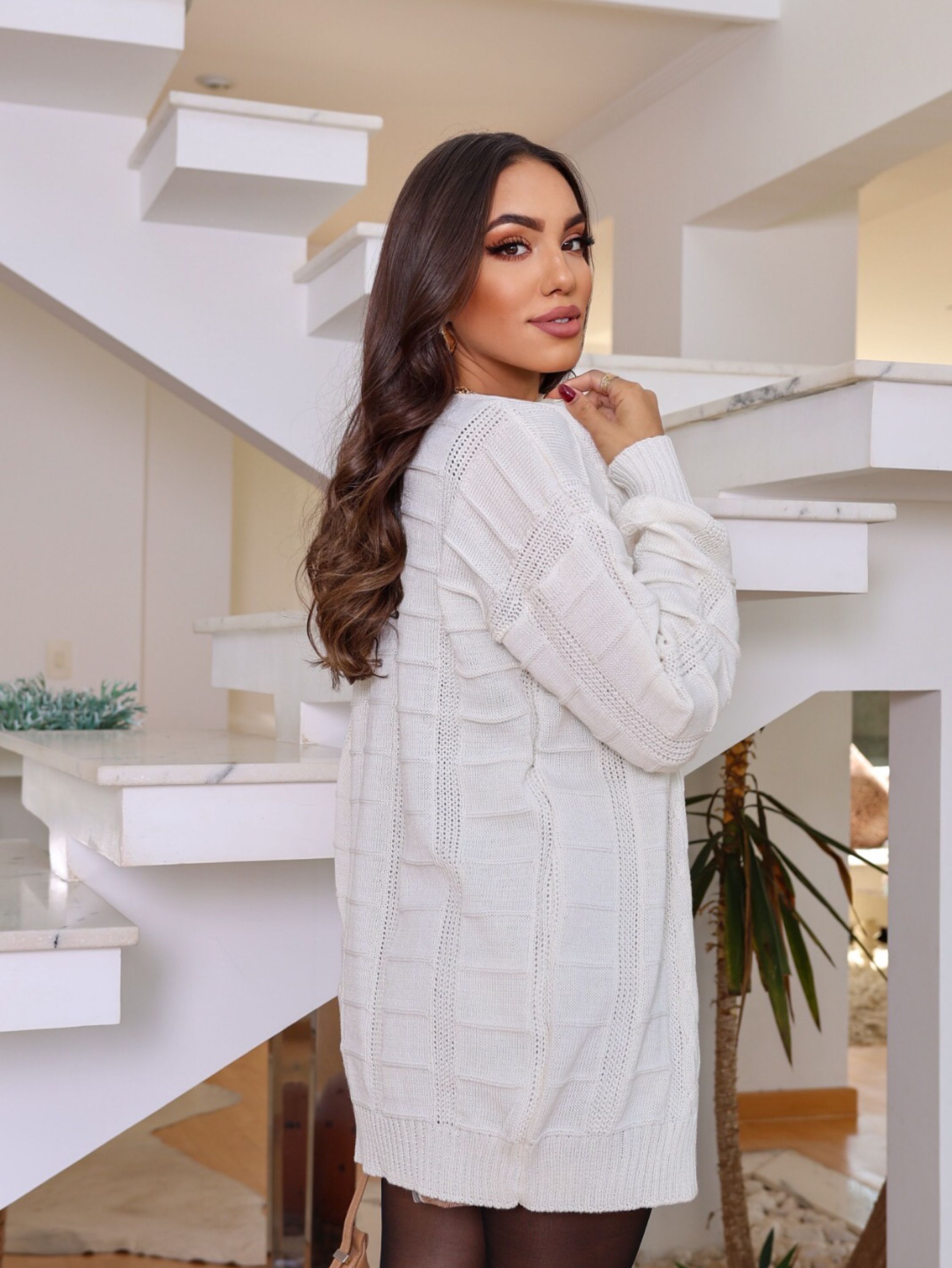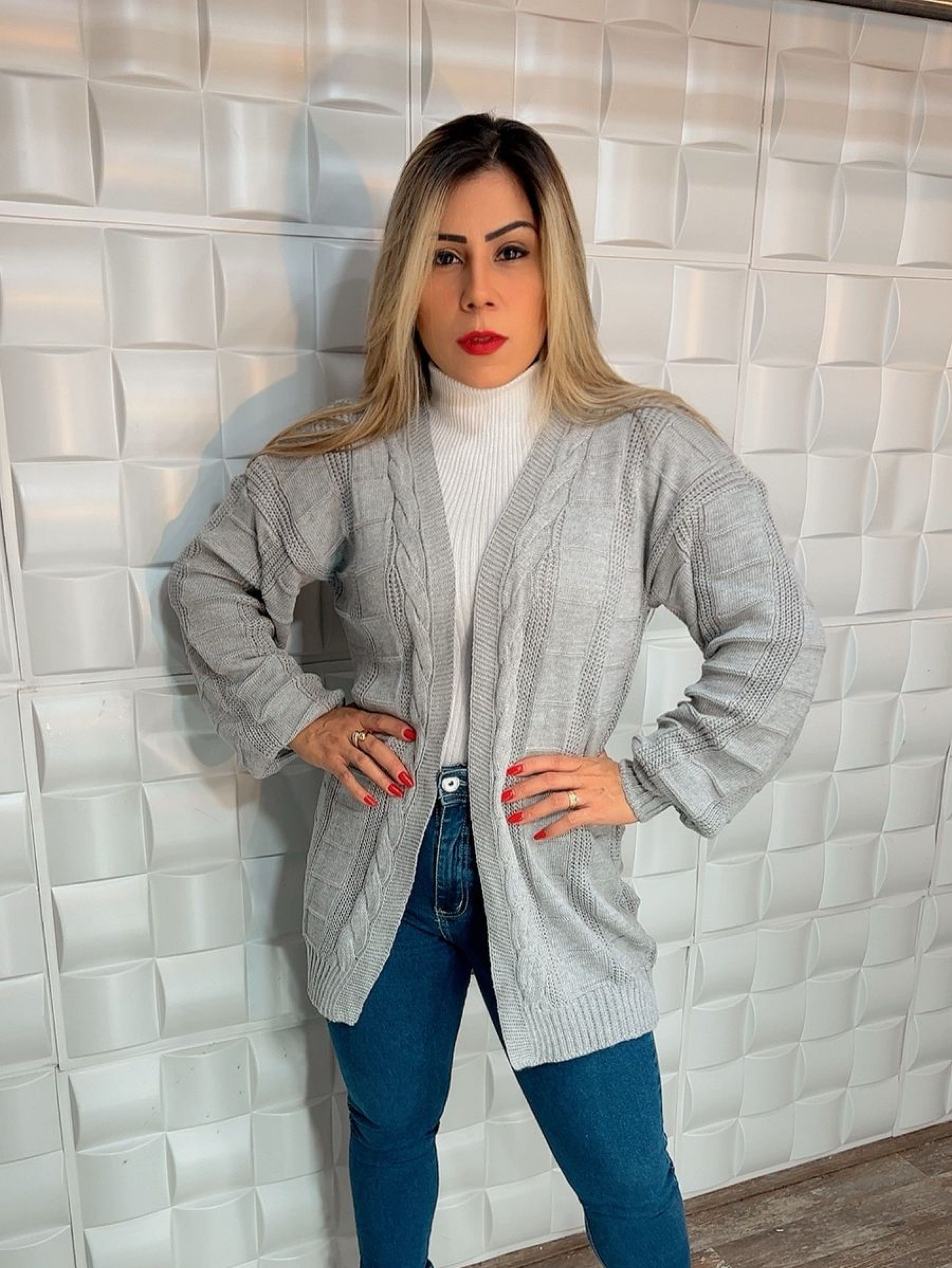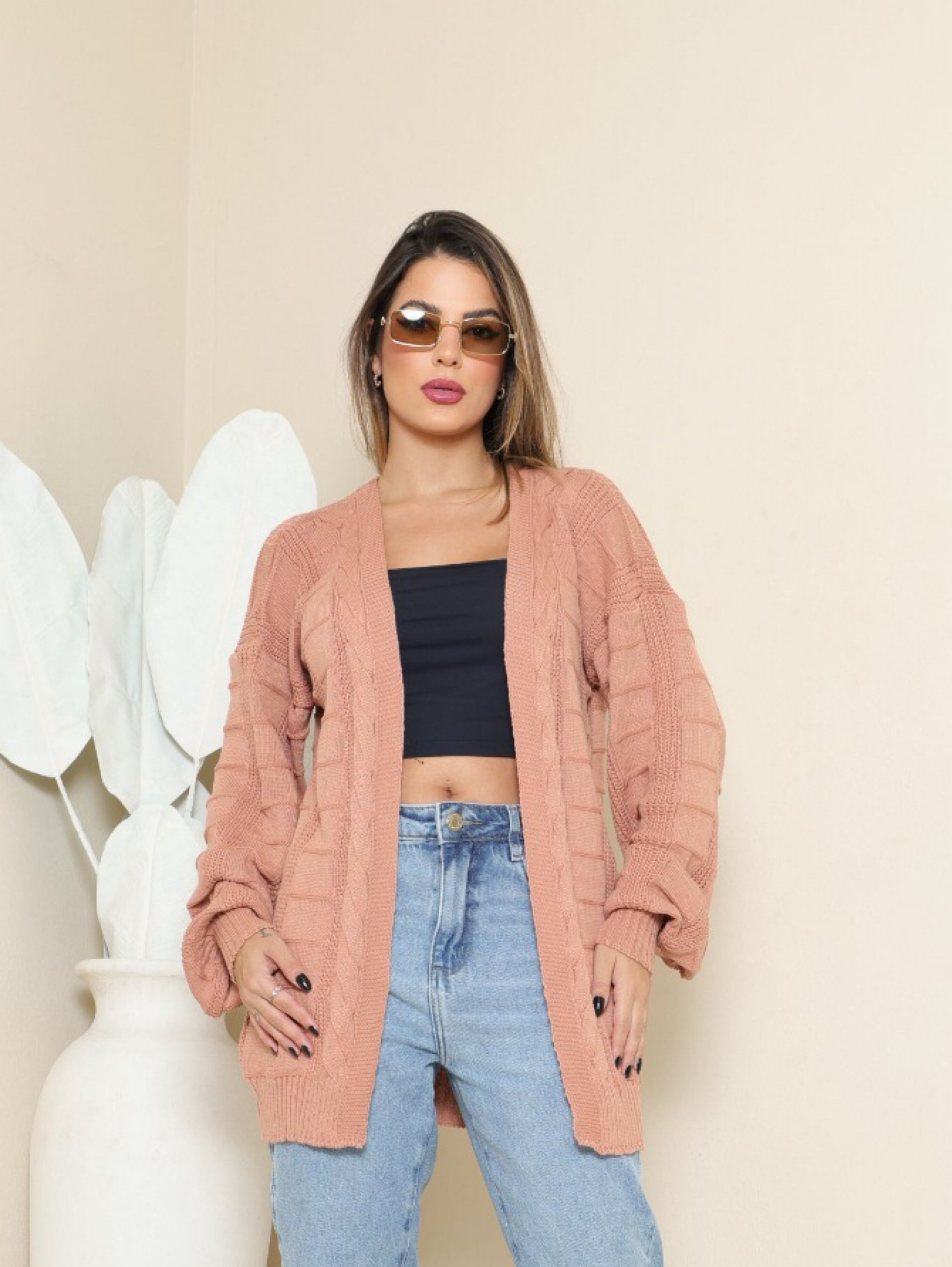Cardigan Tricot Trança Manga Bufante Moda Feminina