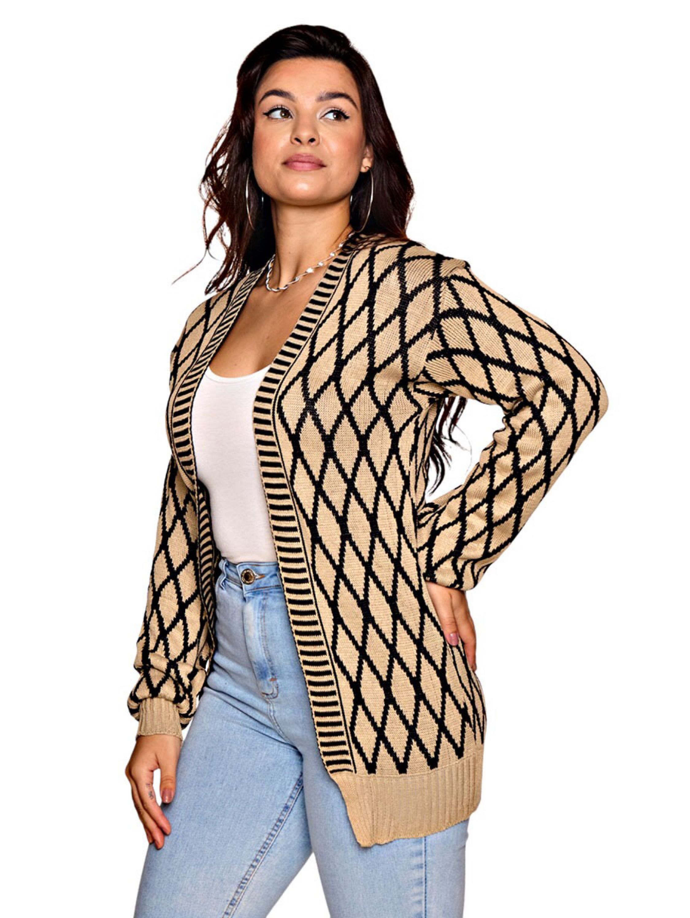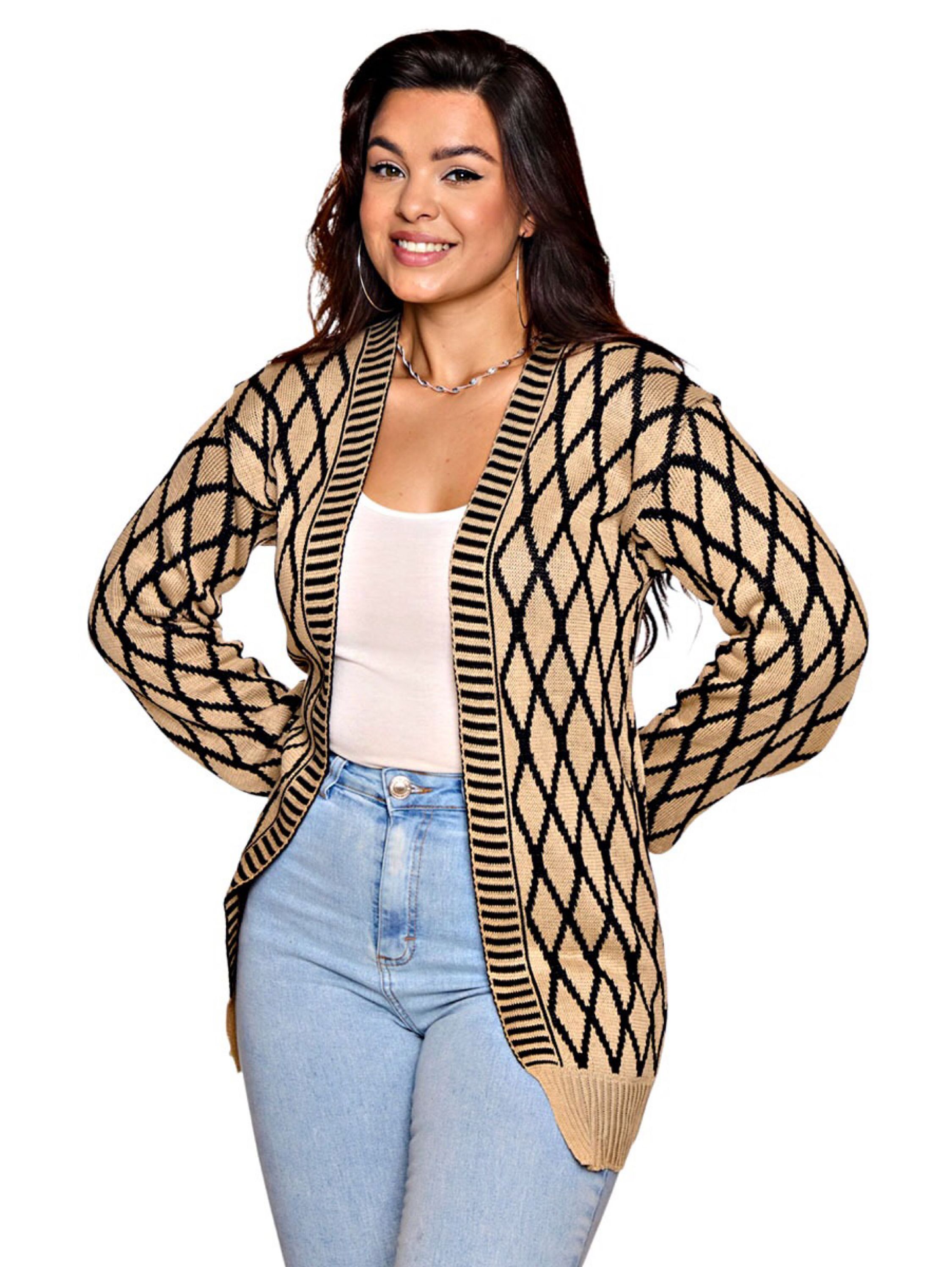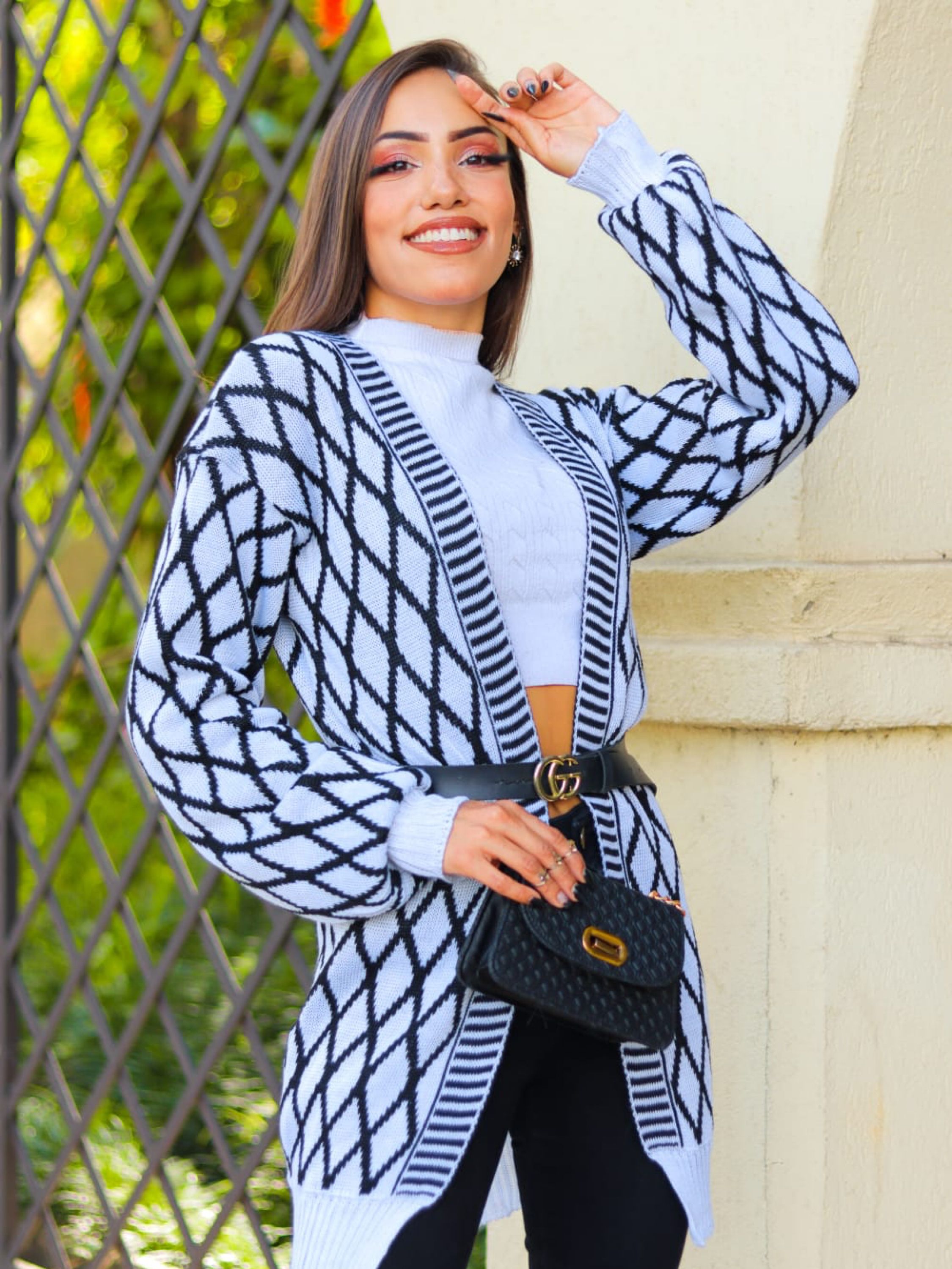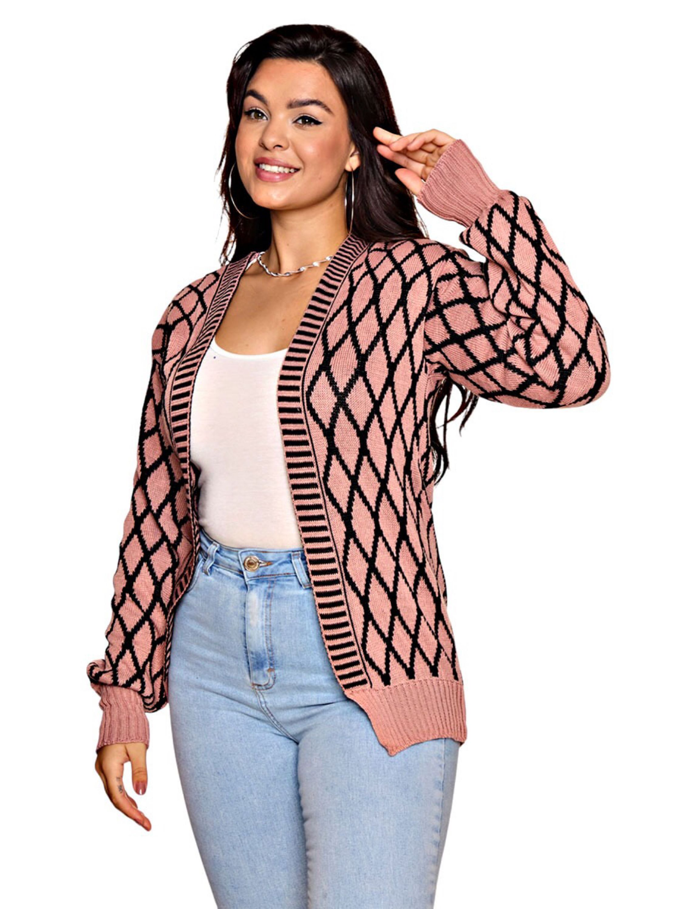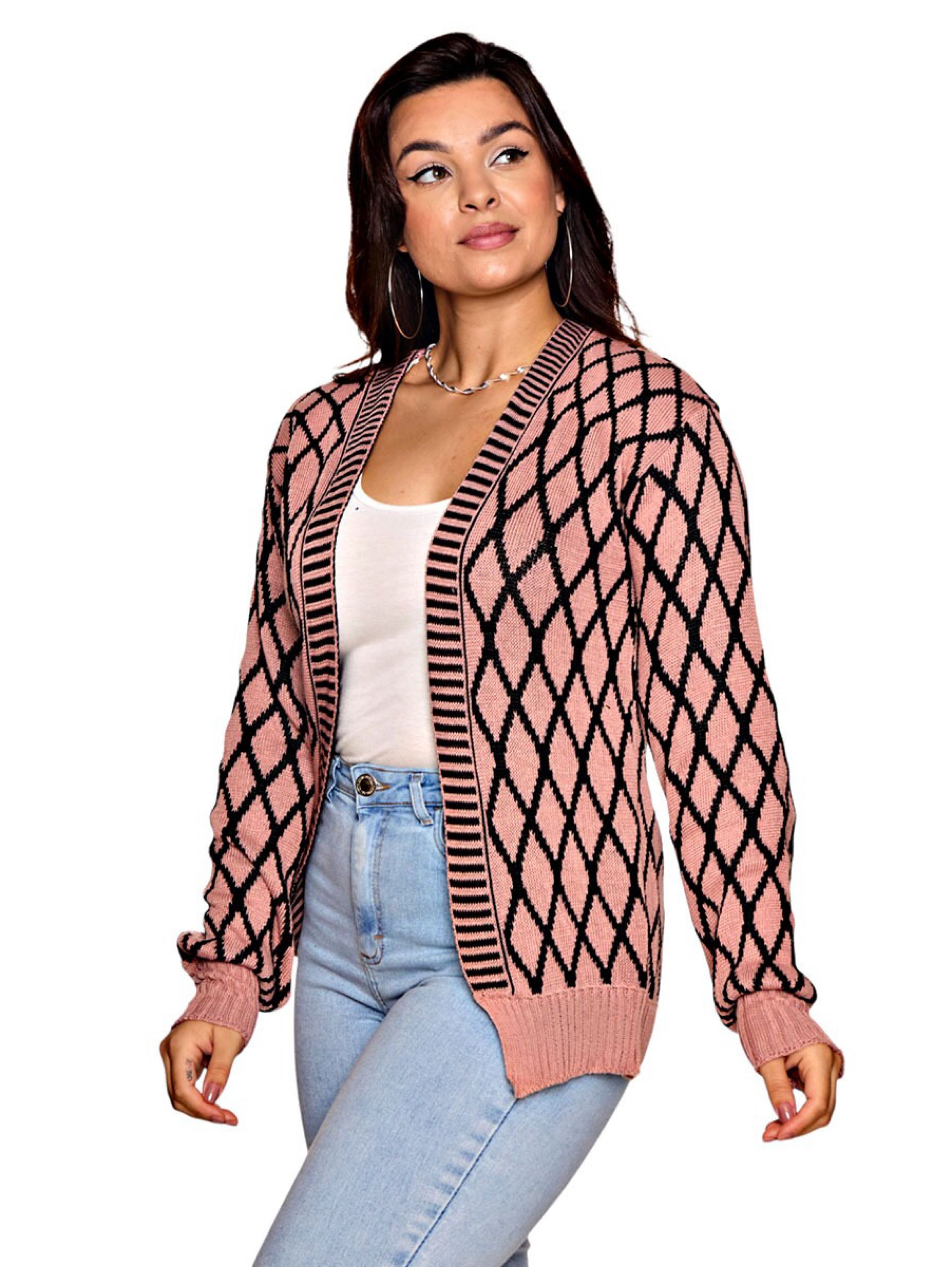 Cardigan Tricô Losango Manga Longa Casaco Tendência
