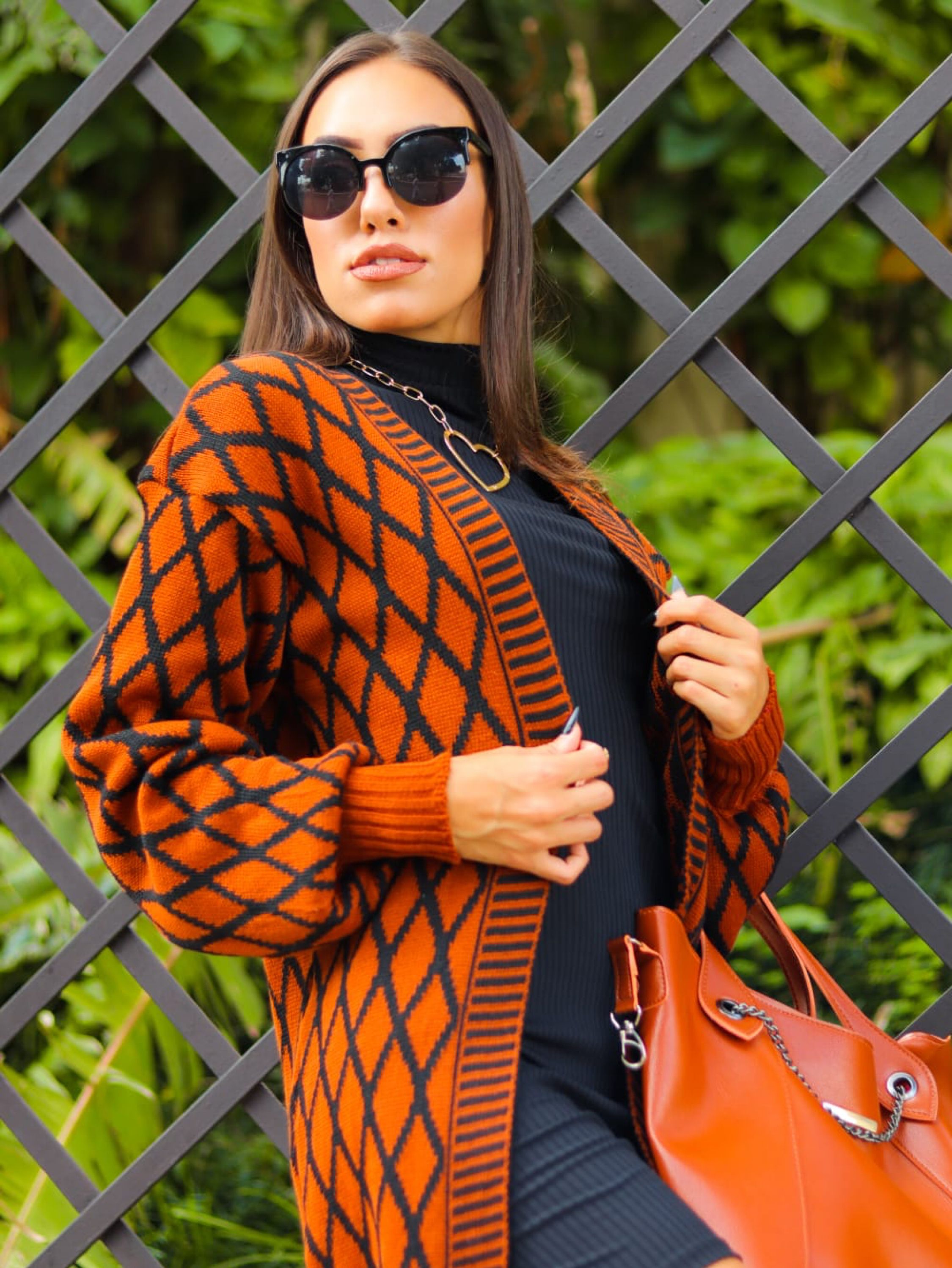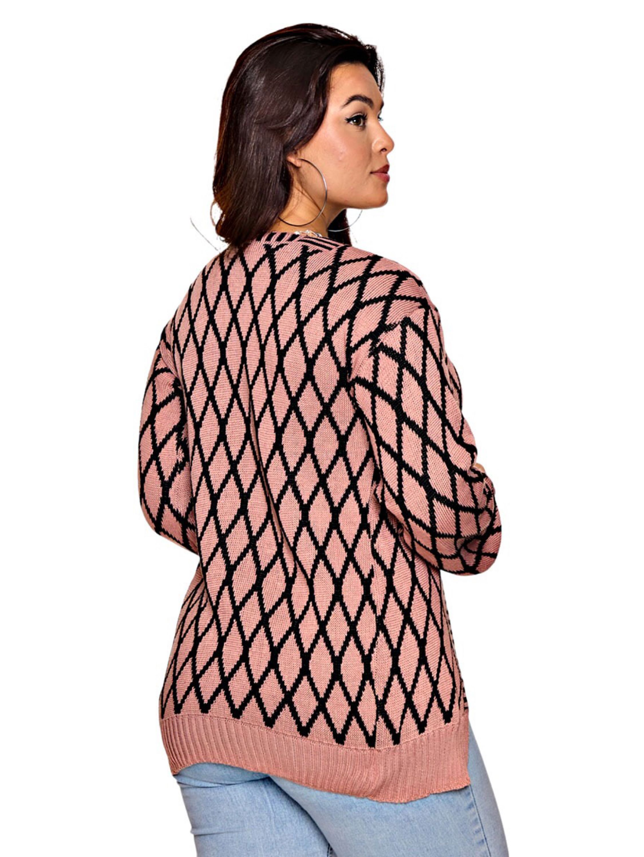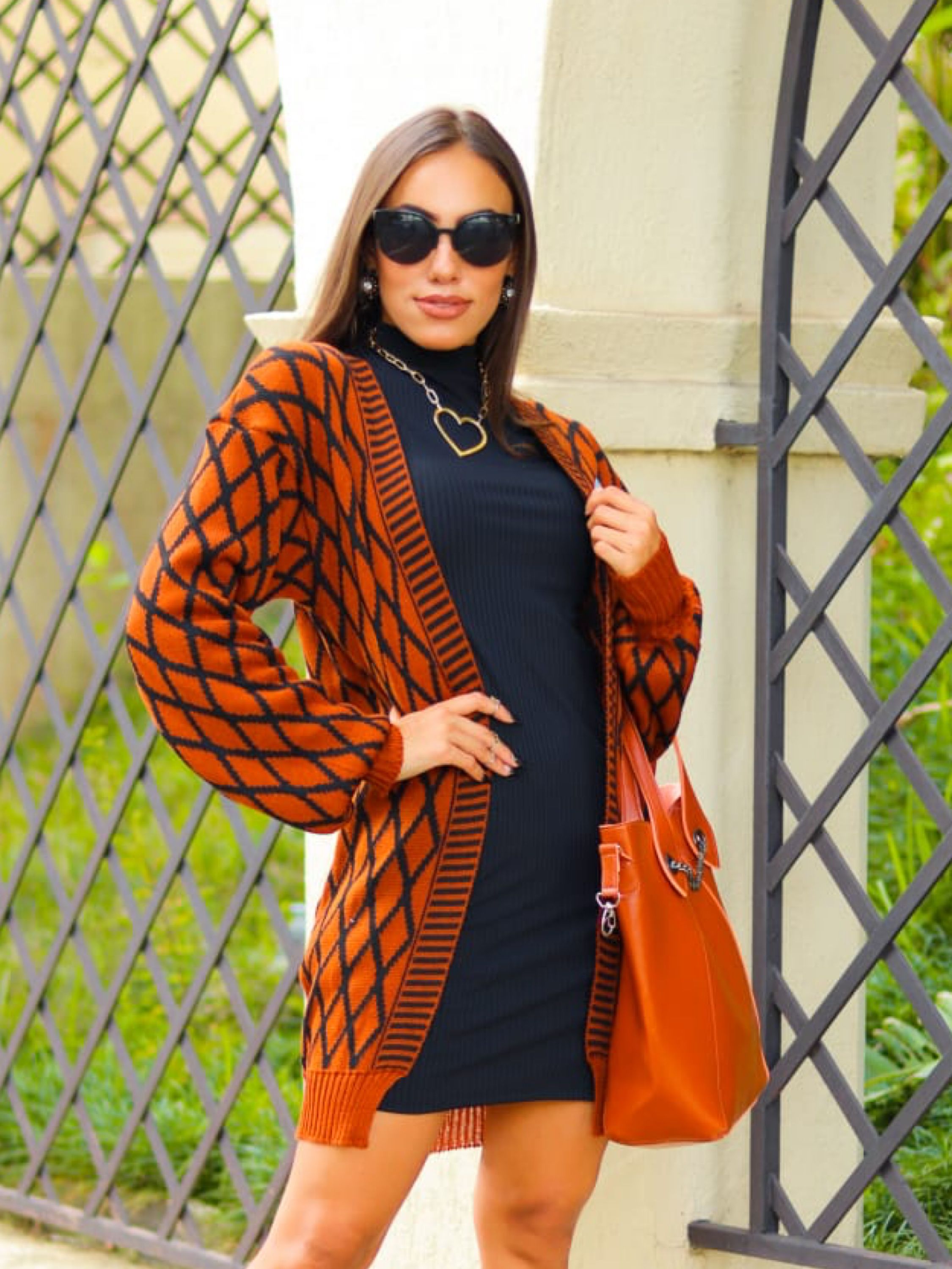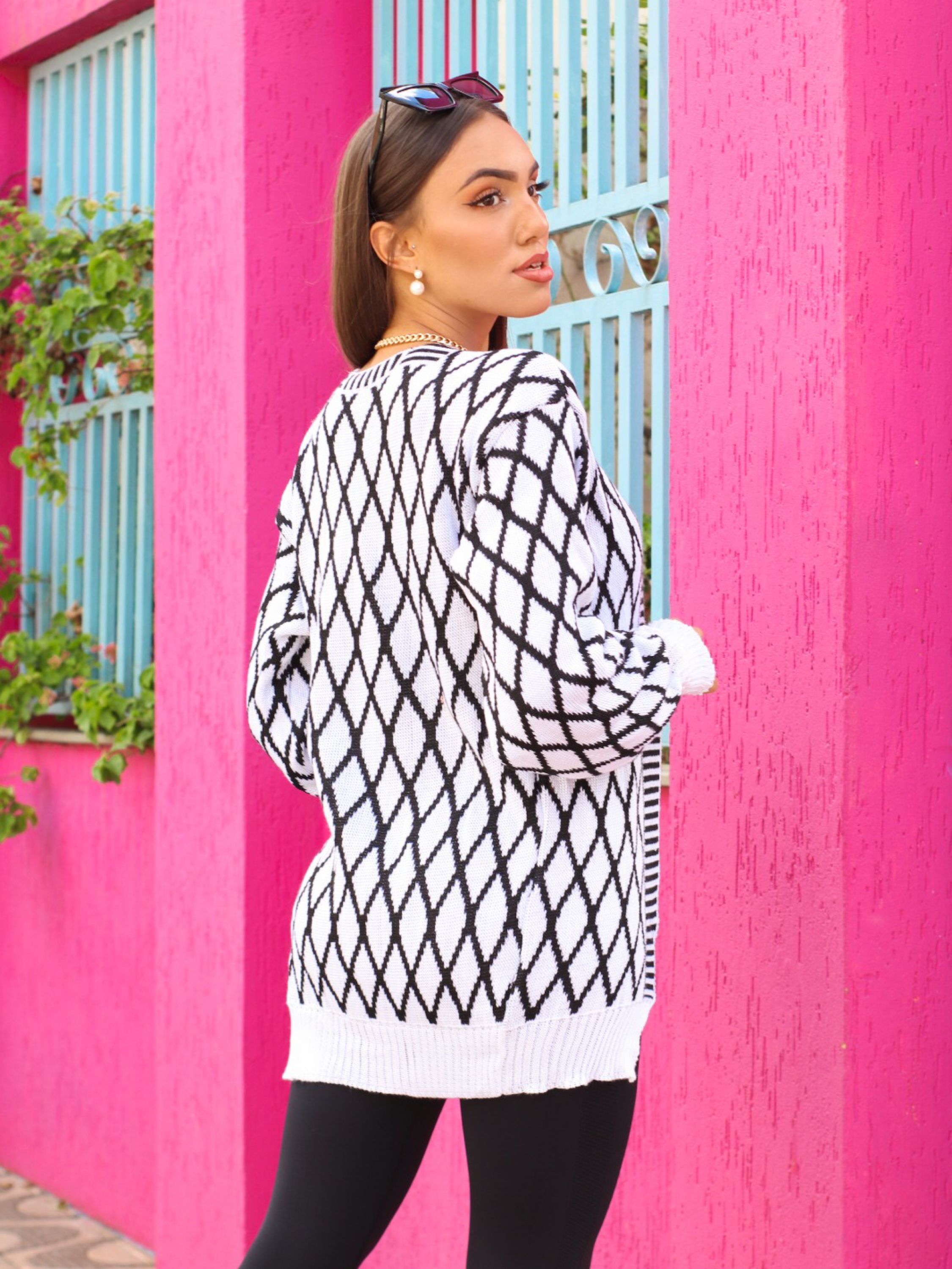 Cardigan Tricô Losango Manga Longa Casaco Tendência