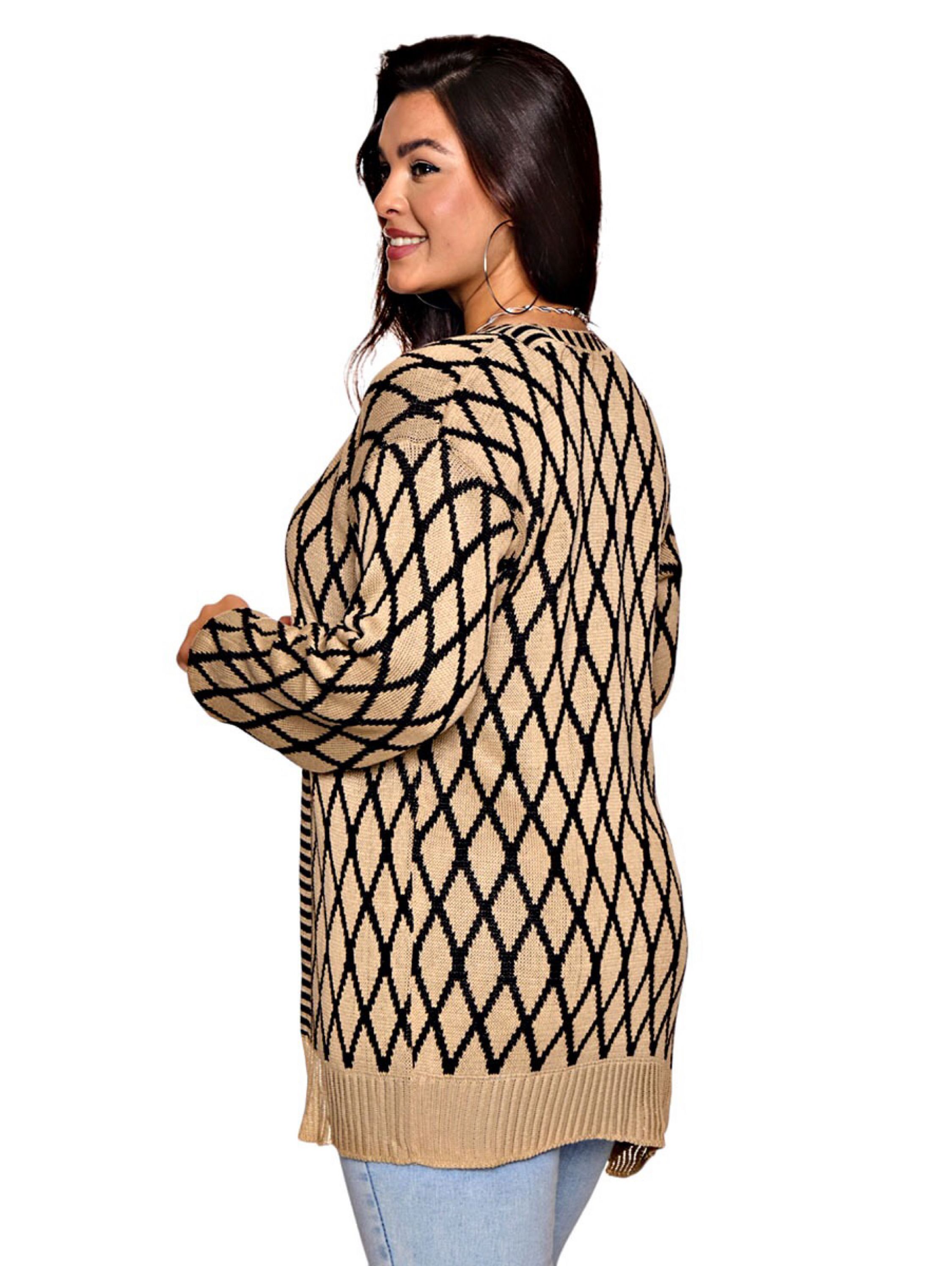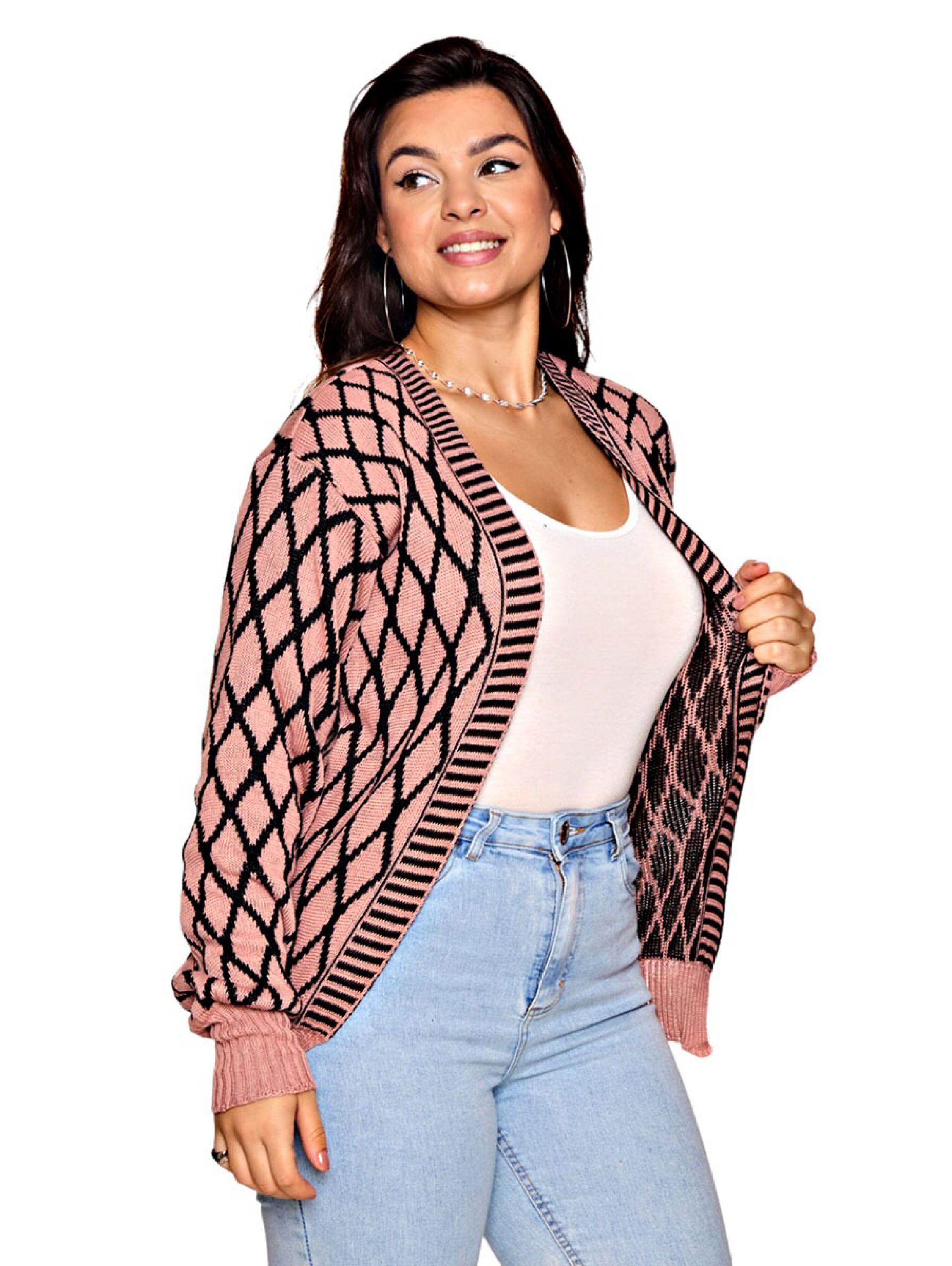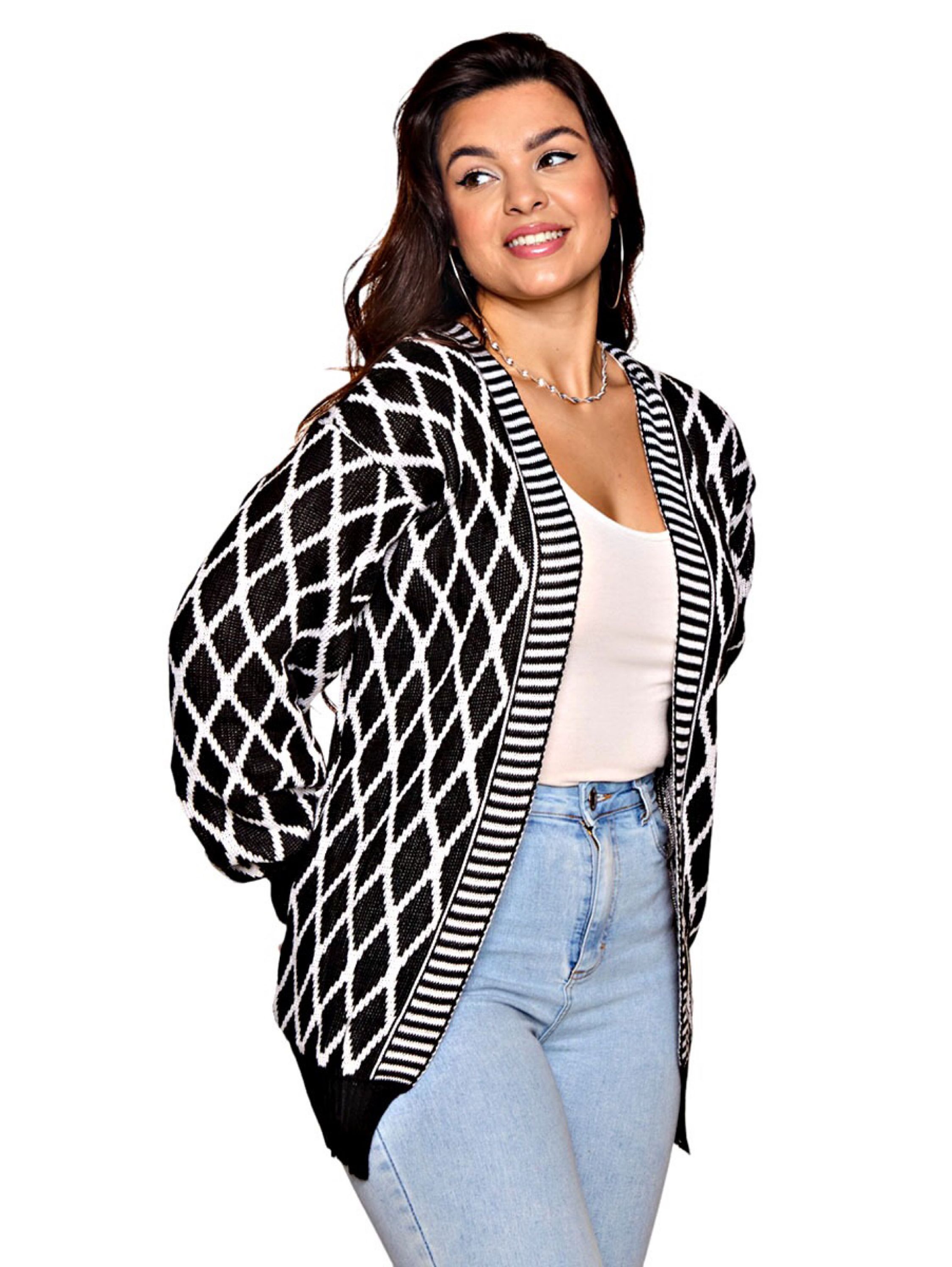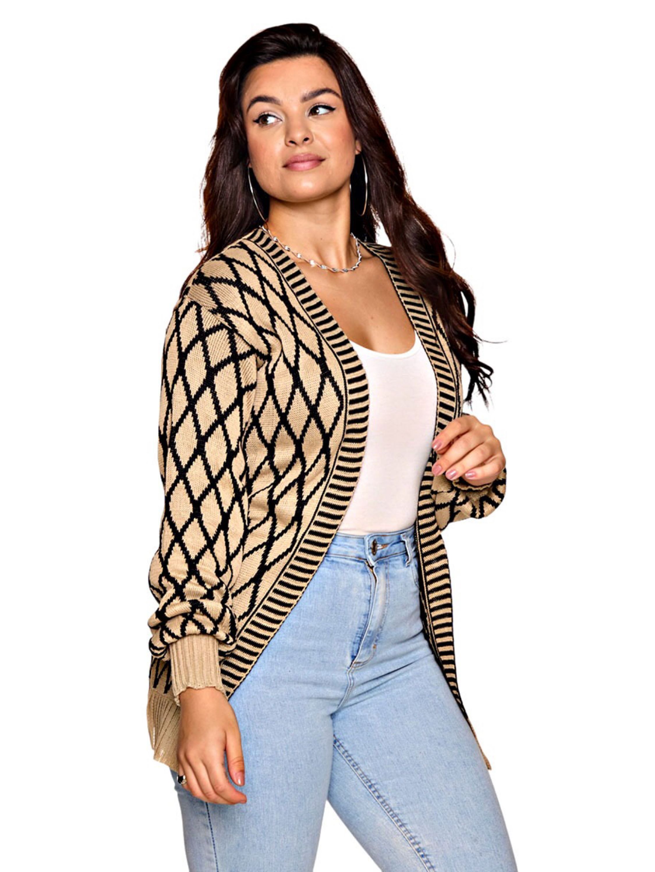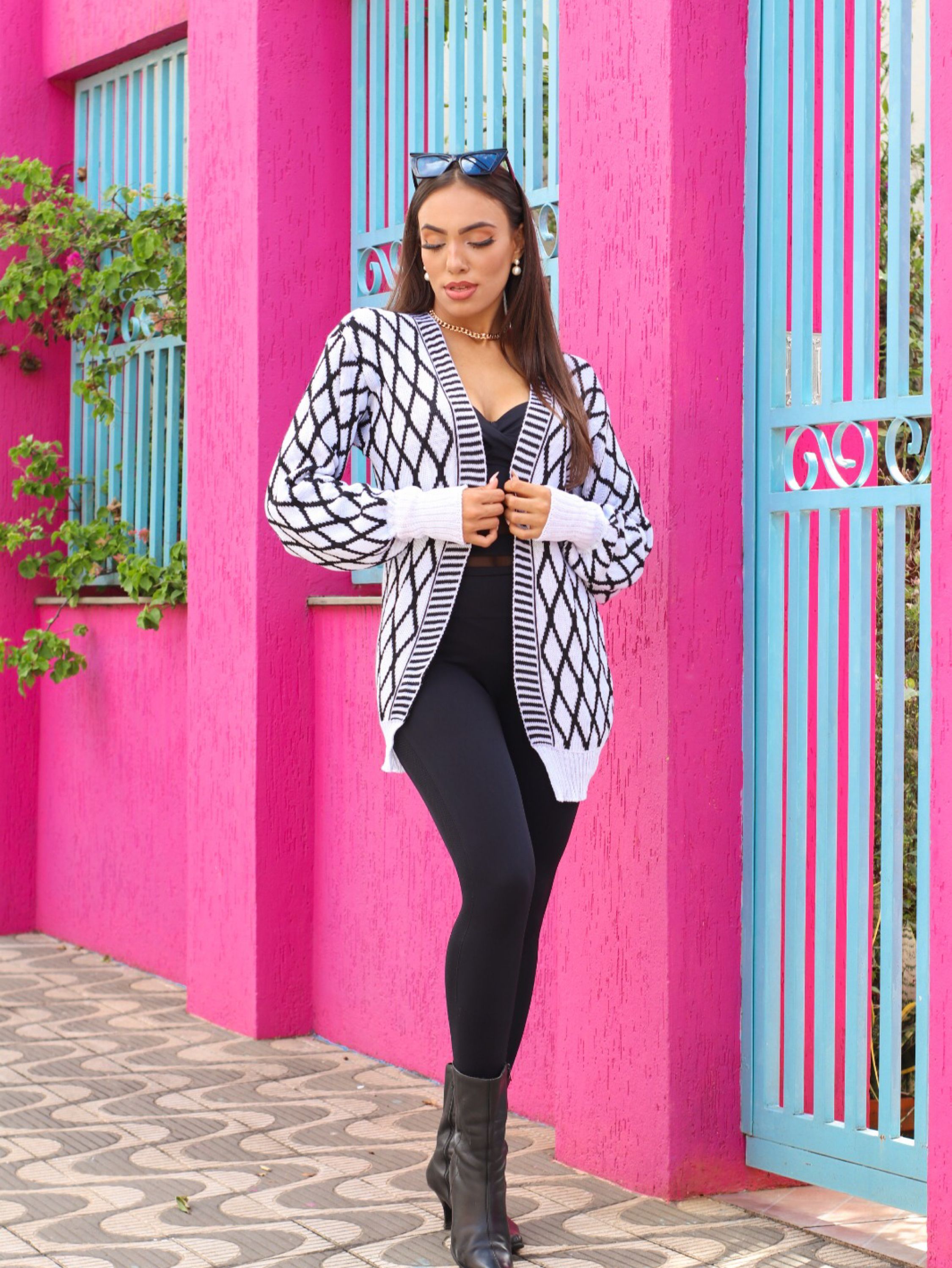 Cardigan Tricô Losango Manga Longa Casaco Tendência