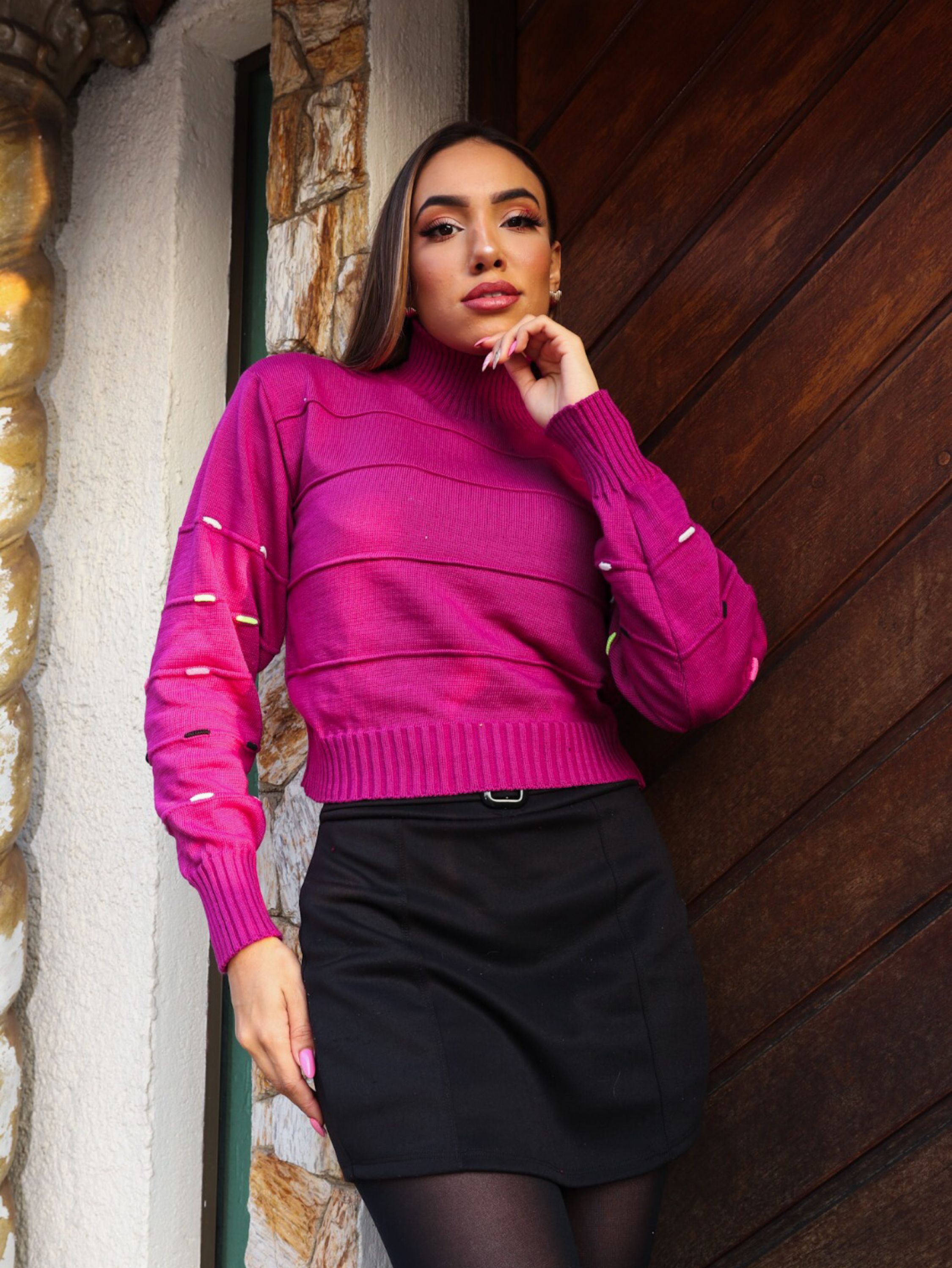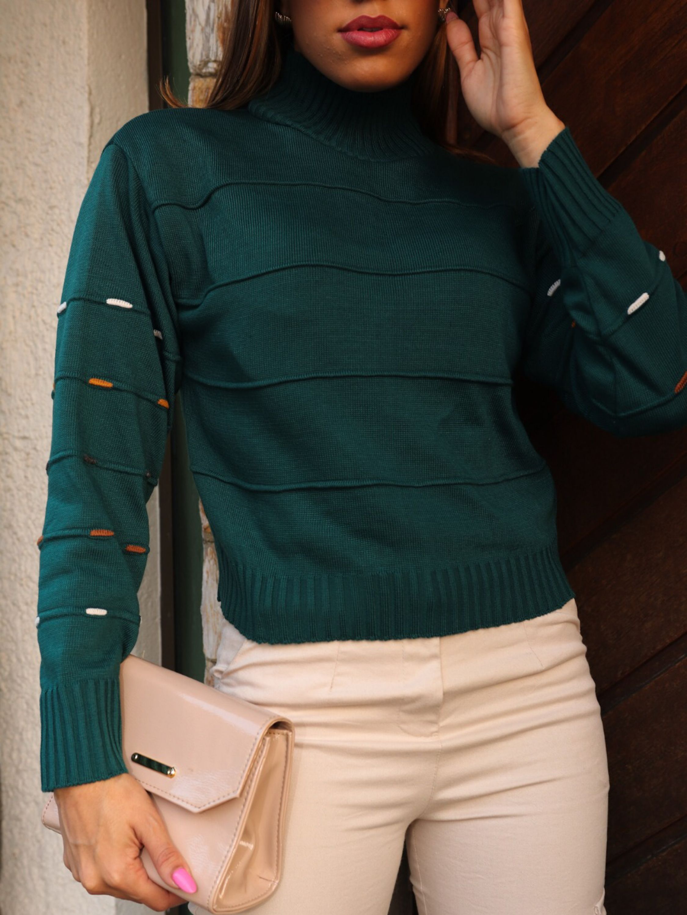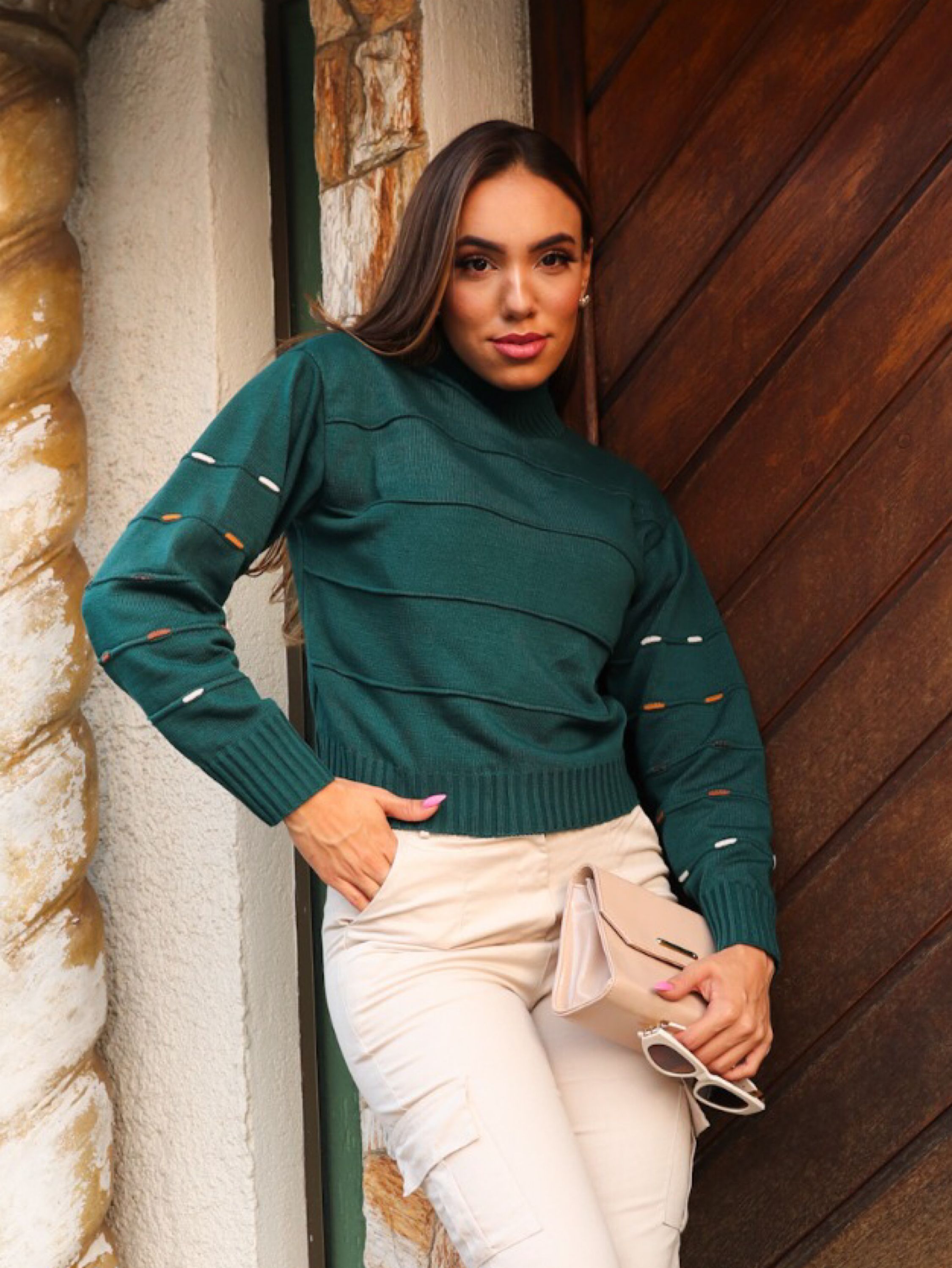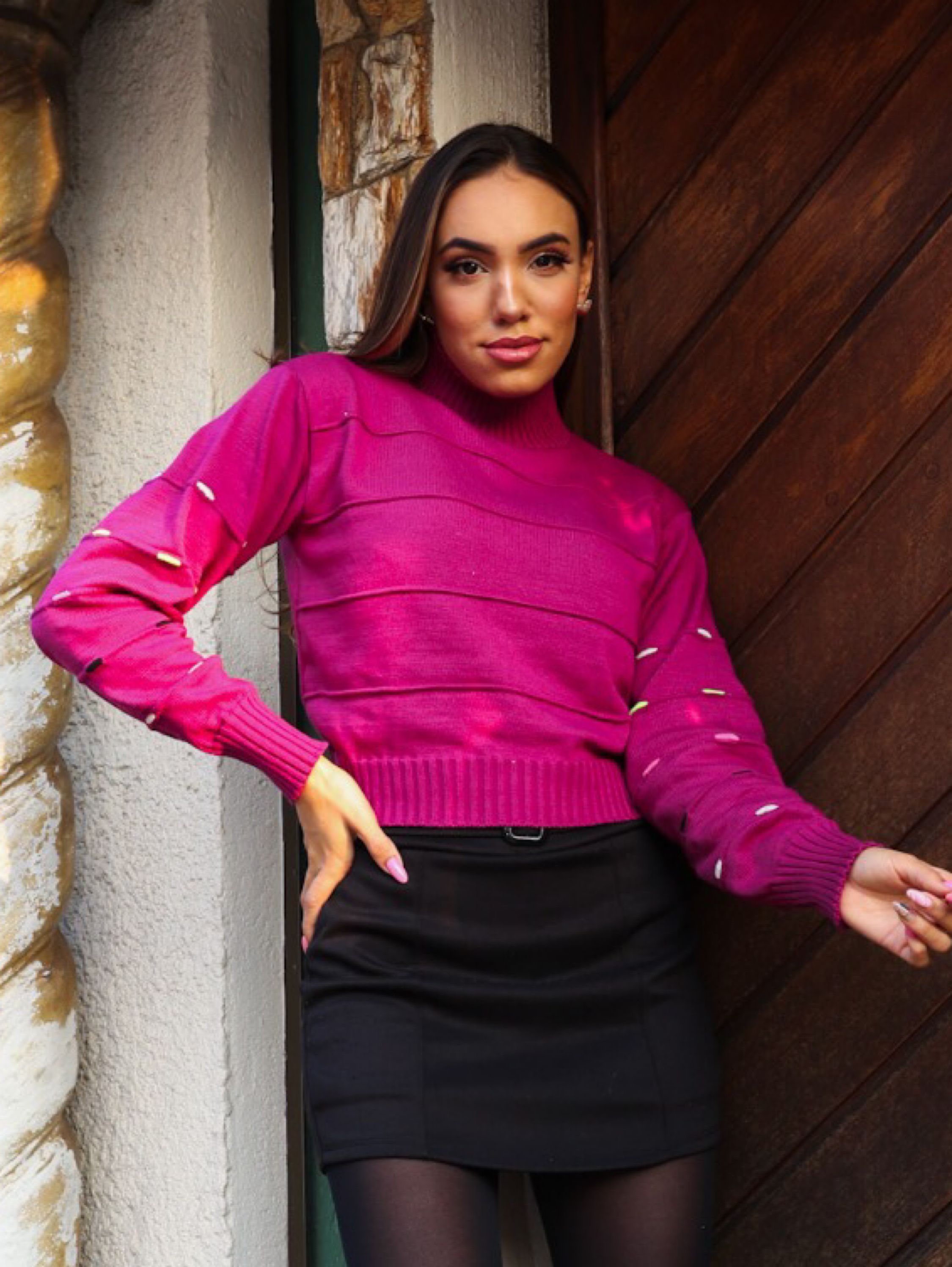 Cropped de Tricot, Com detalhes em bolinhas coloridas nas mangas e gola Cacharrel. Tamanho Único (veste do 38 ao 44)