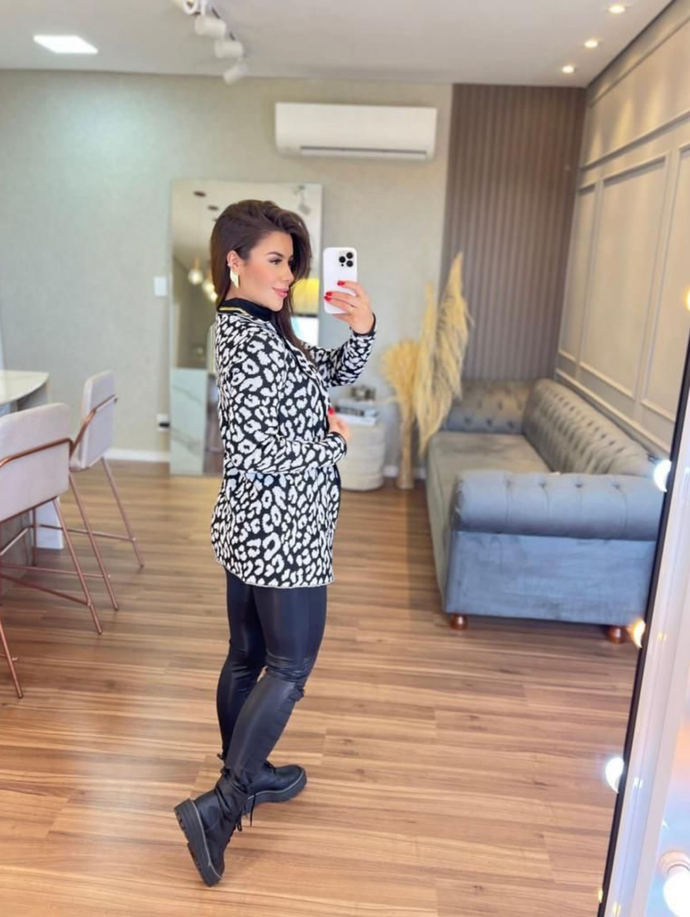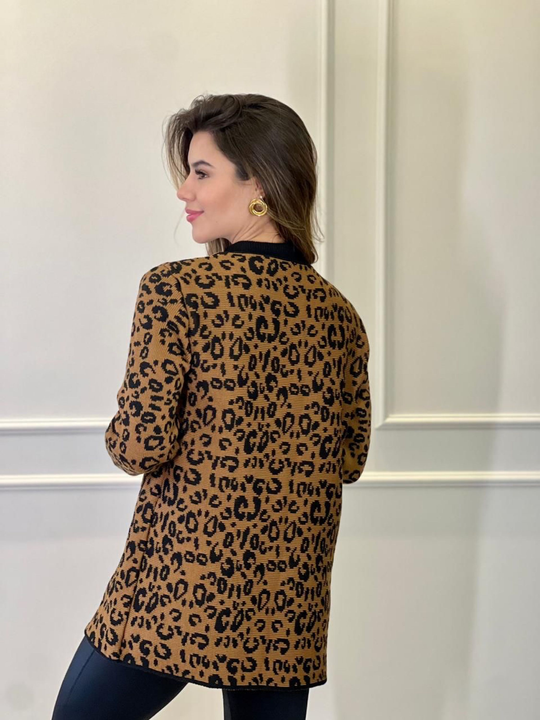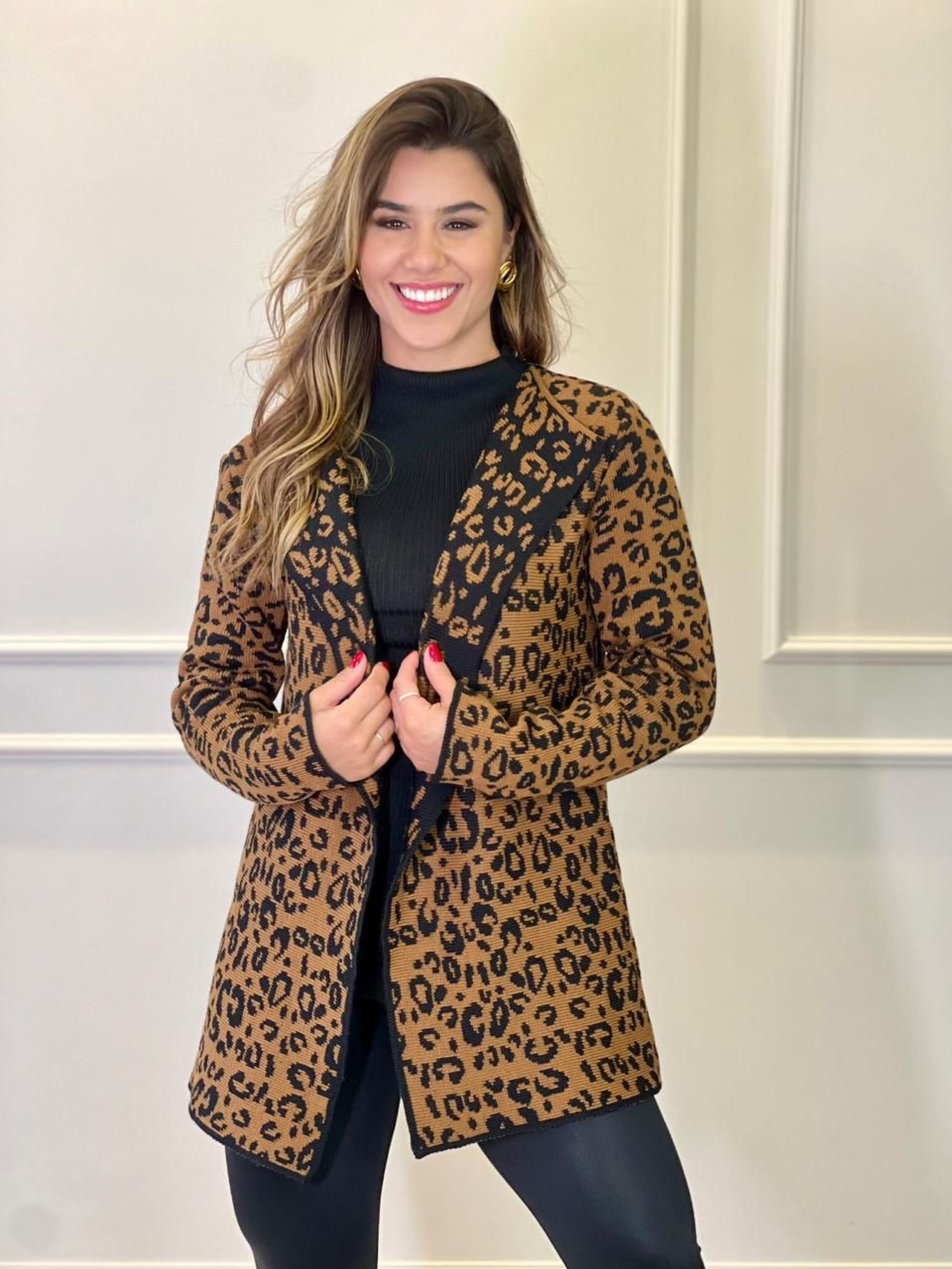 Cardigã de Tricot, Com estampa em oncinha, gola dobrada, textura grossa! Tamanho Único. (Veste do 38 ao 42)