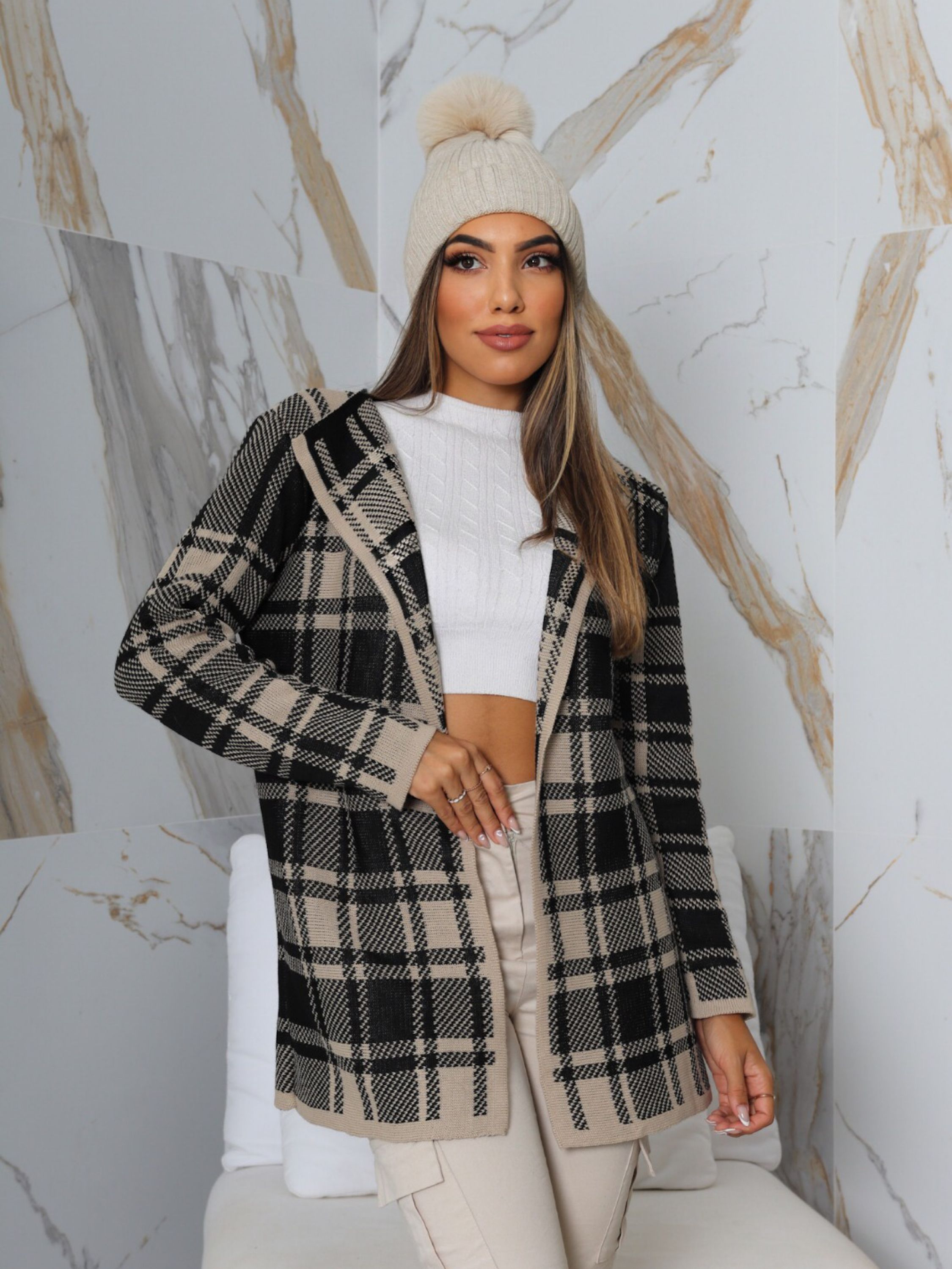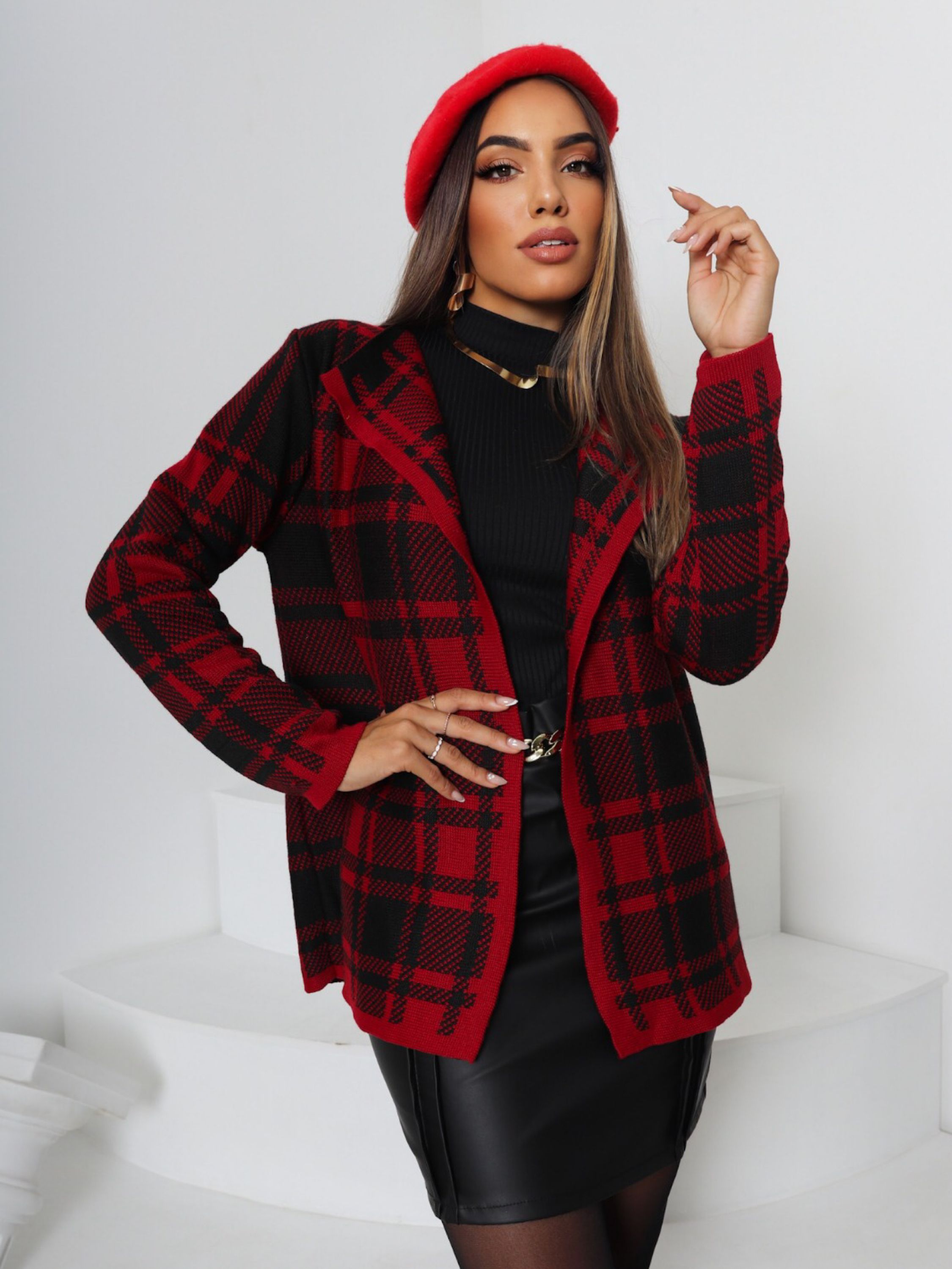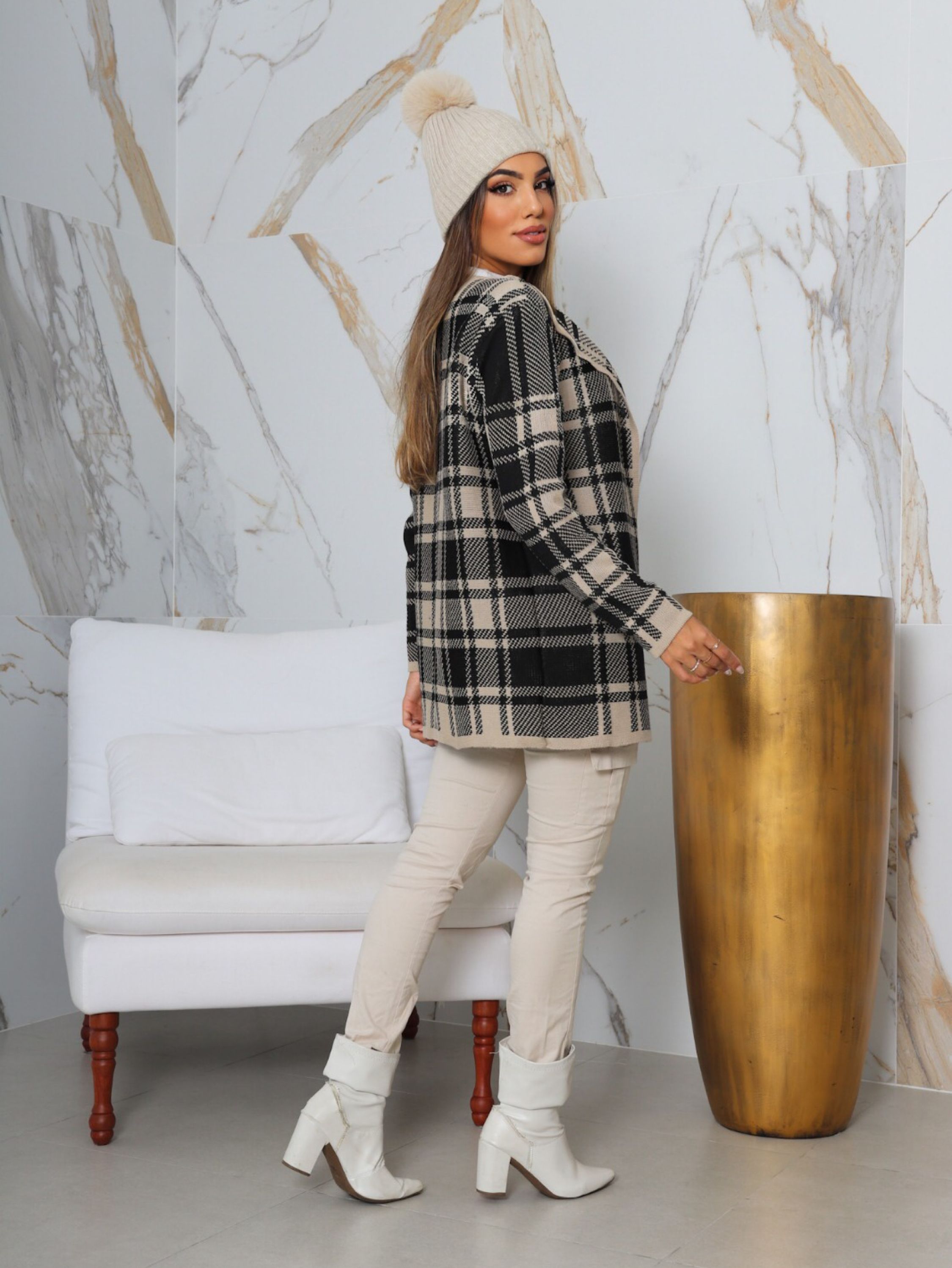 Cardigã Tricô Lorena Xadrez Manga Longa