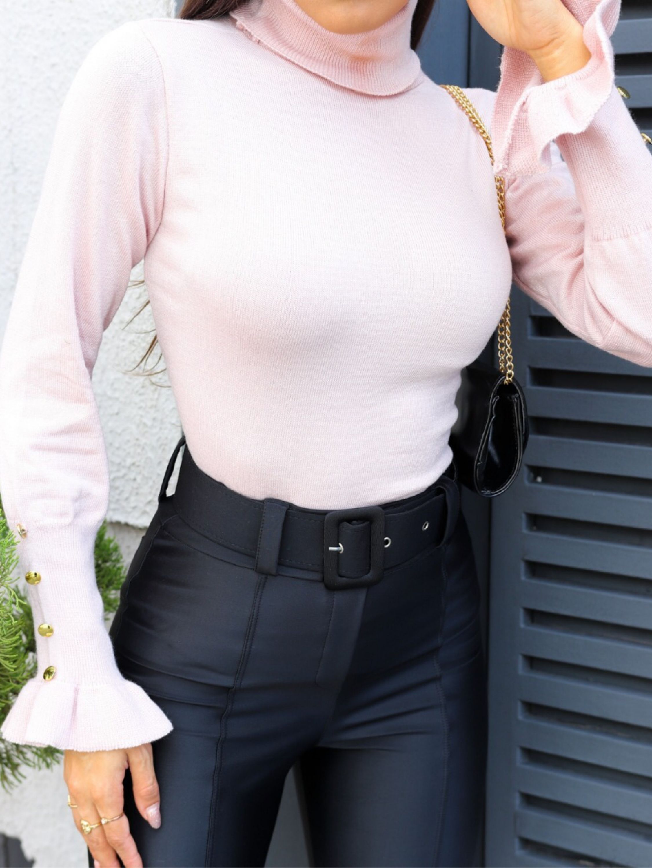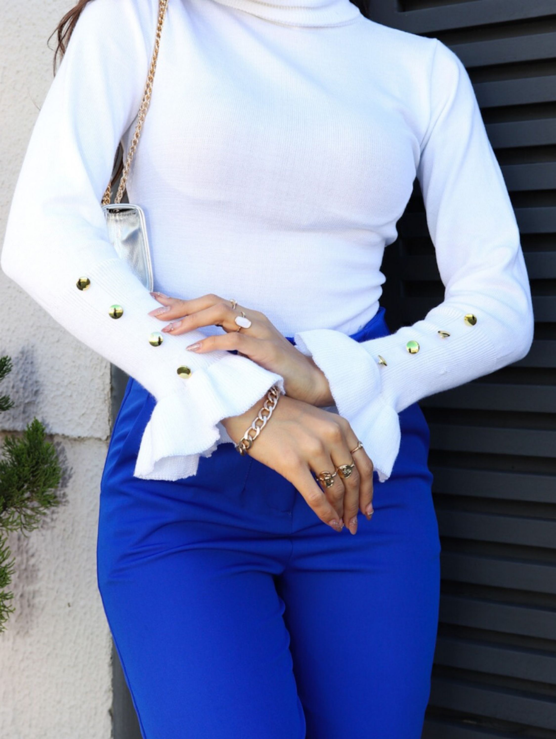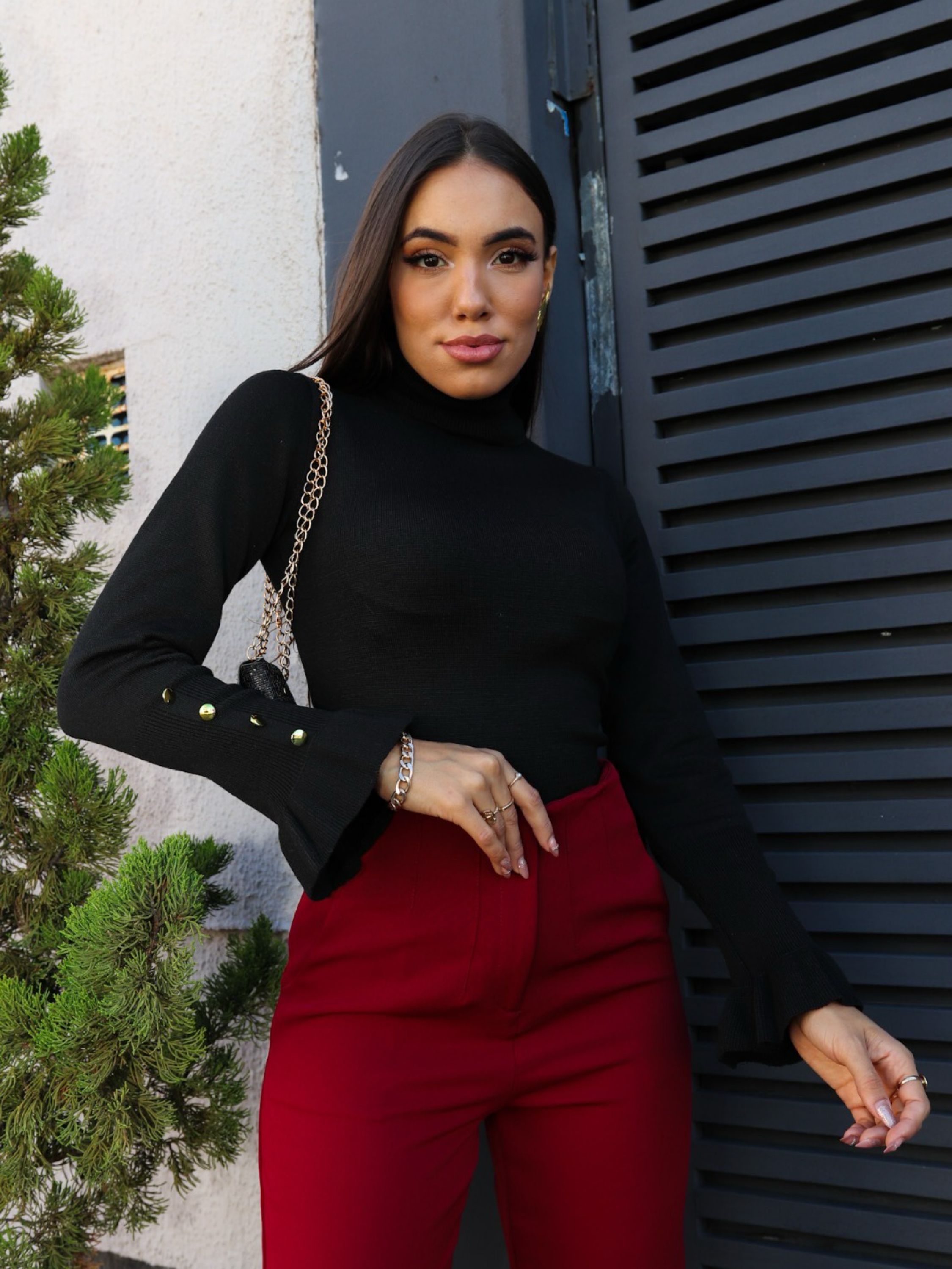Blusa de Tricot, com elastano, detalhes de botões na manga e manga Flare. Tamanho Único (veste do 38 ao 44)