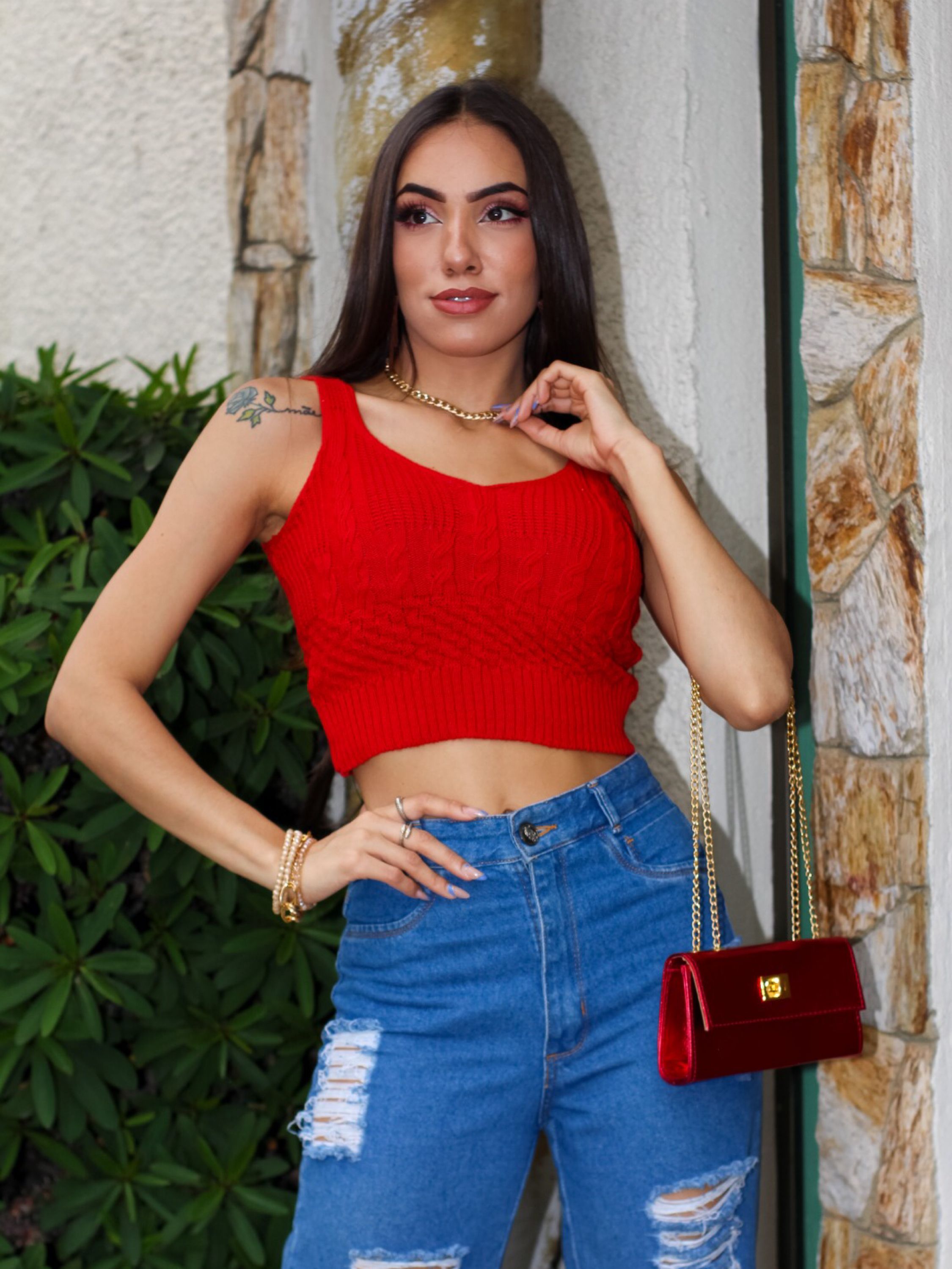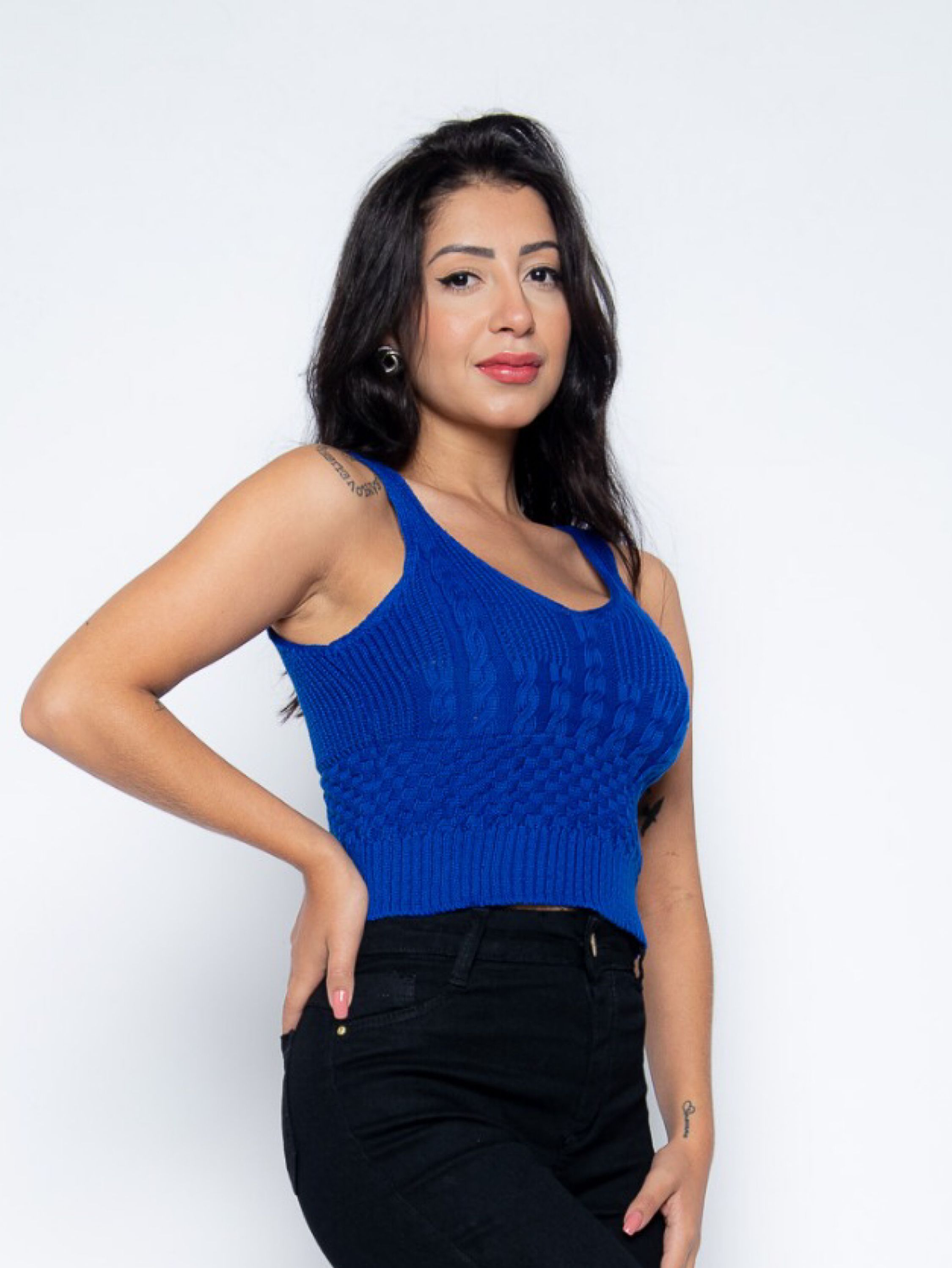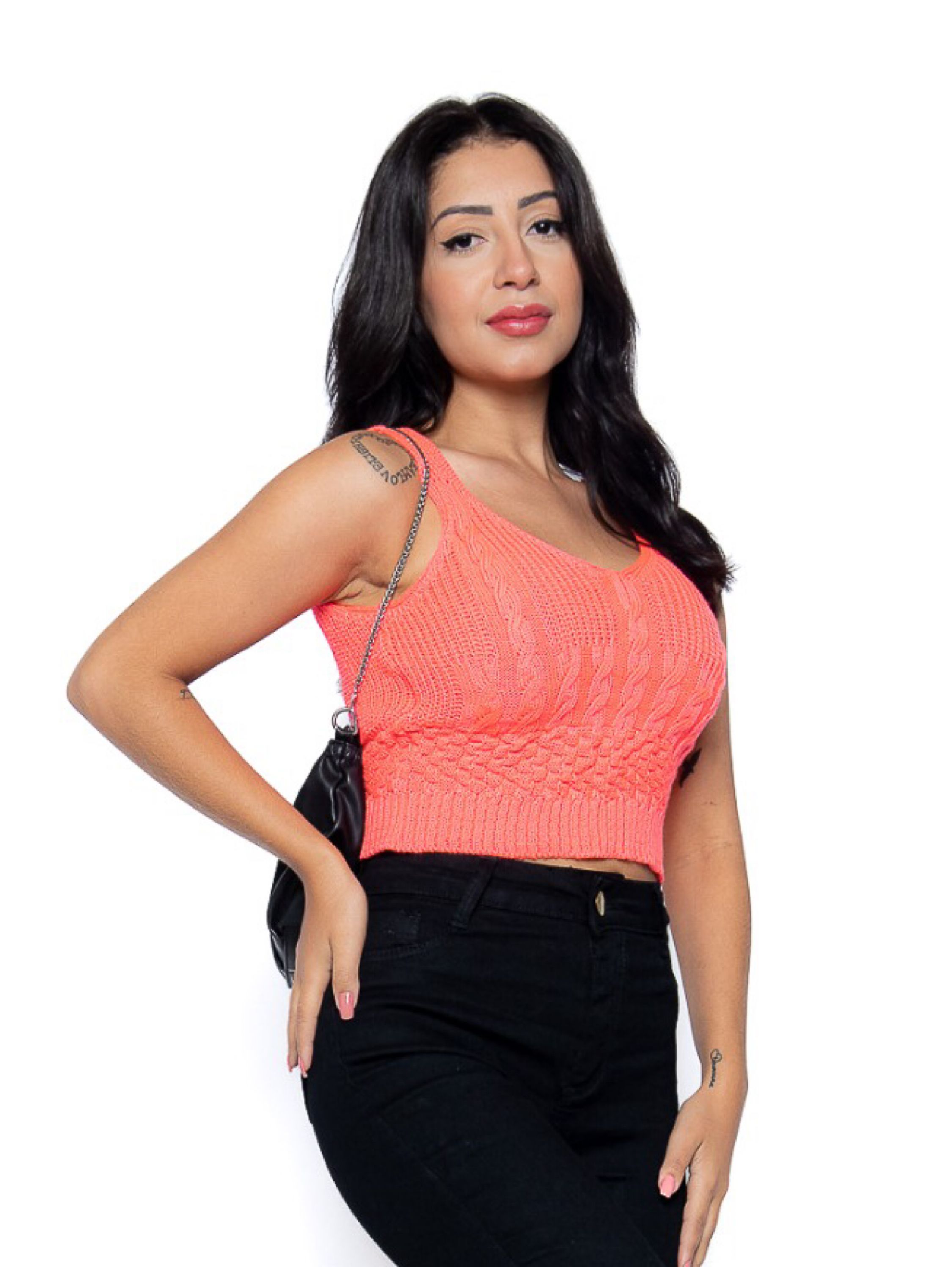 Cropped de Tricot, com tramas em pequenas tranças, sem bojo.