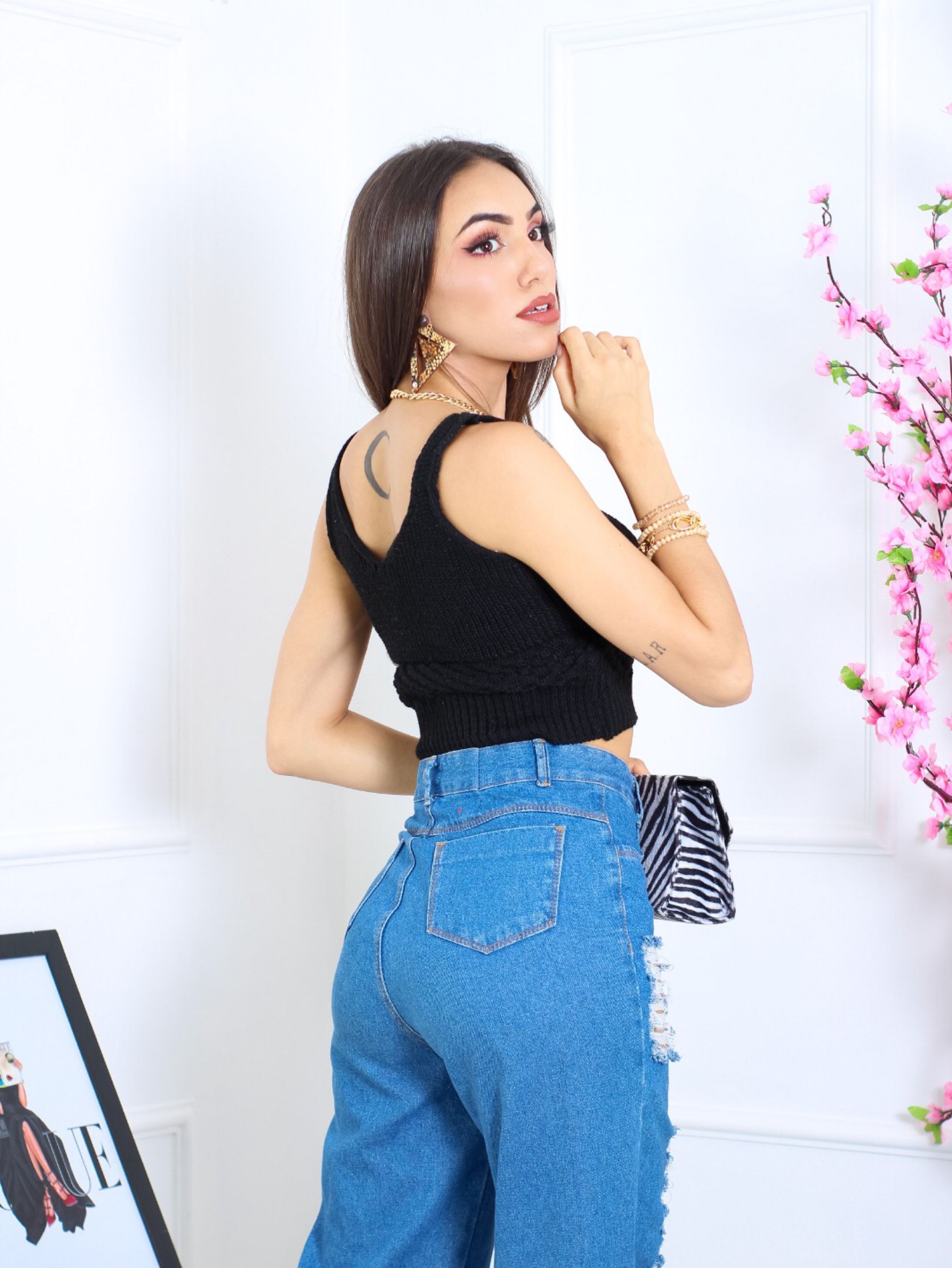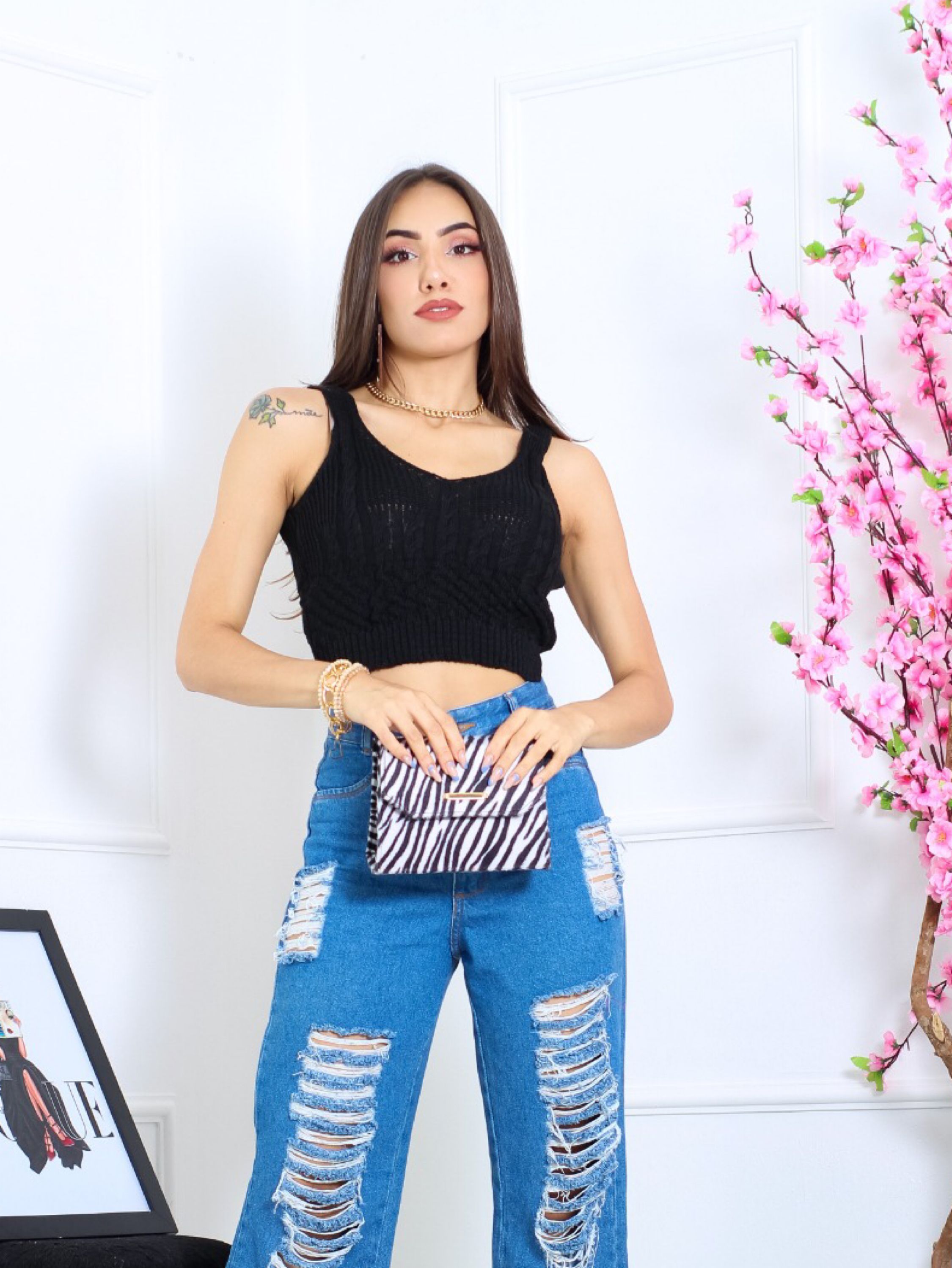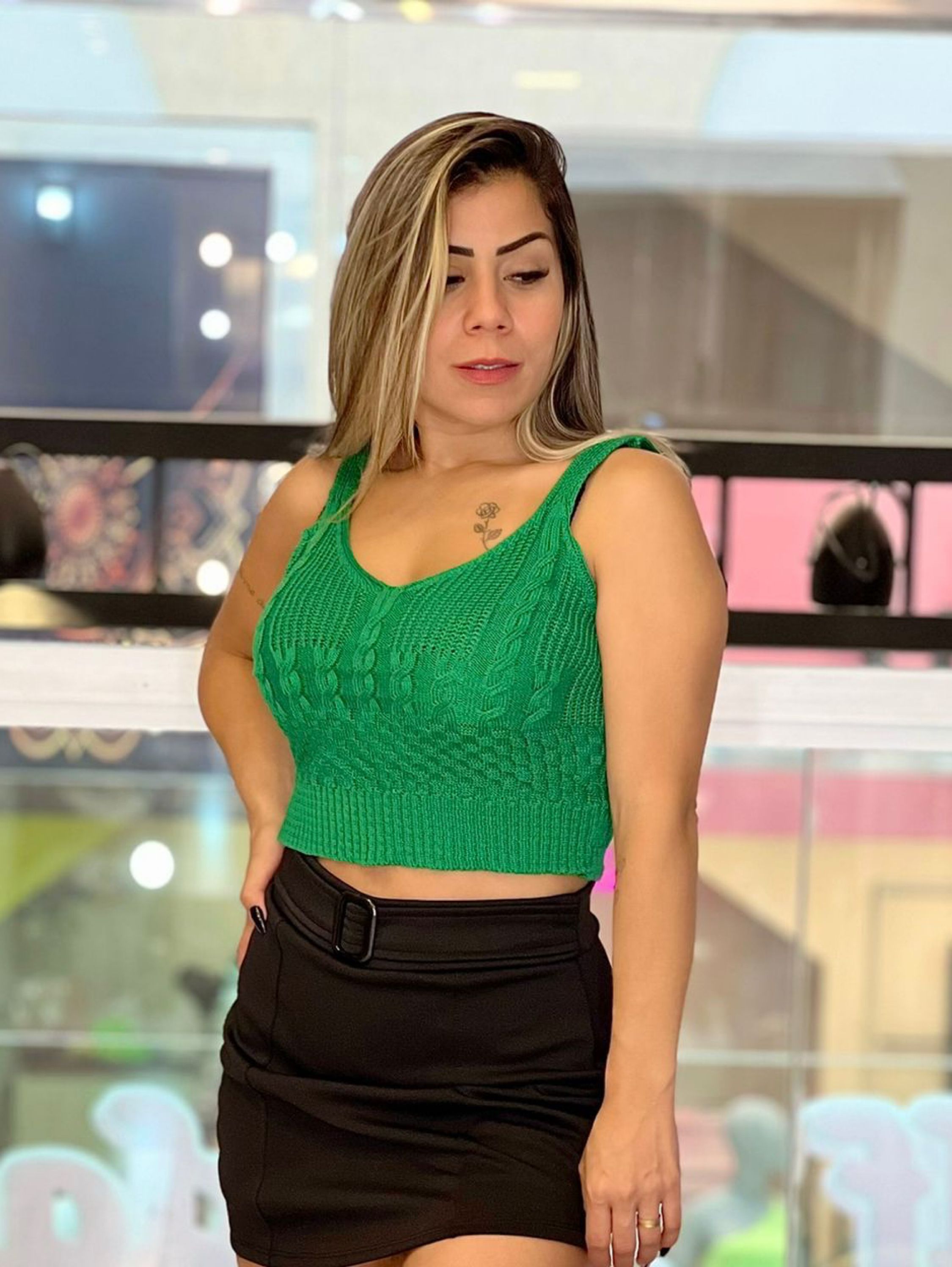 Cropped de Tricot, com tramas em pequenas tranças, sem bojo.
