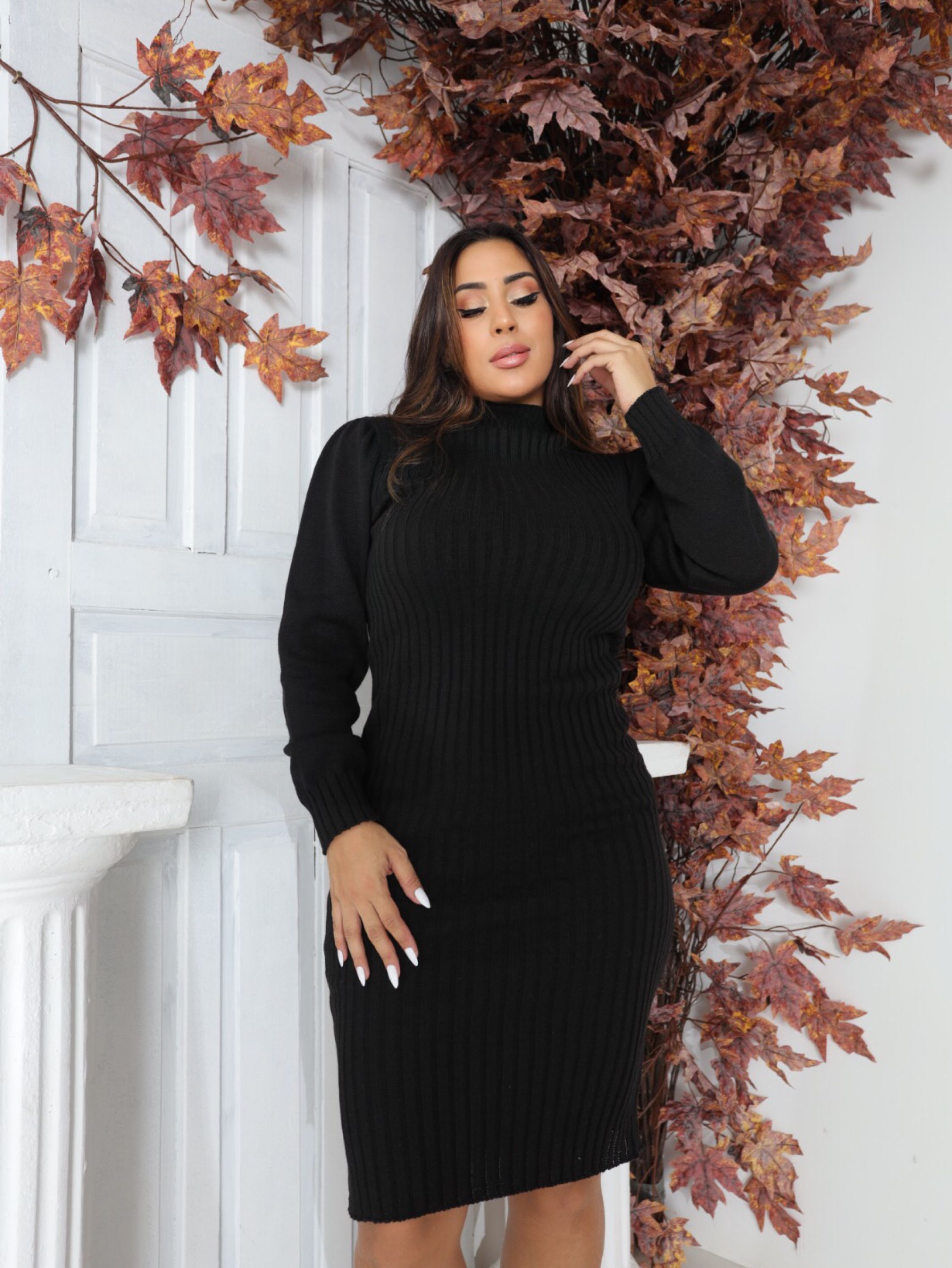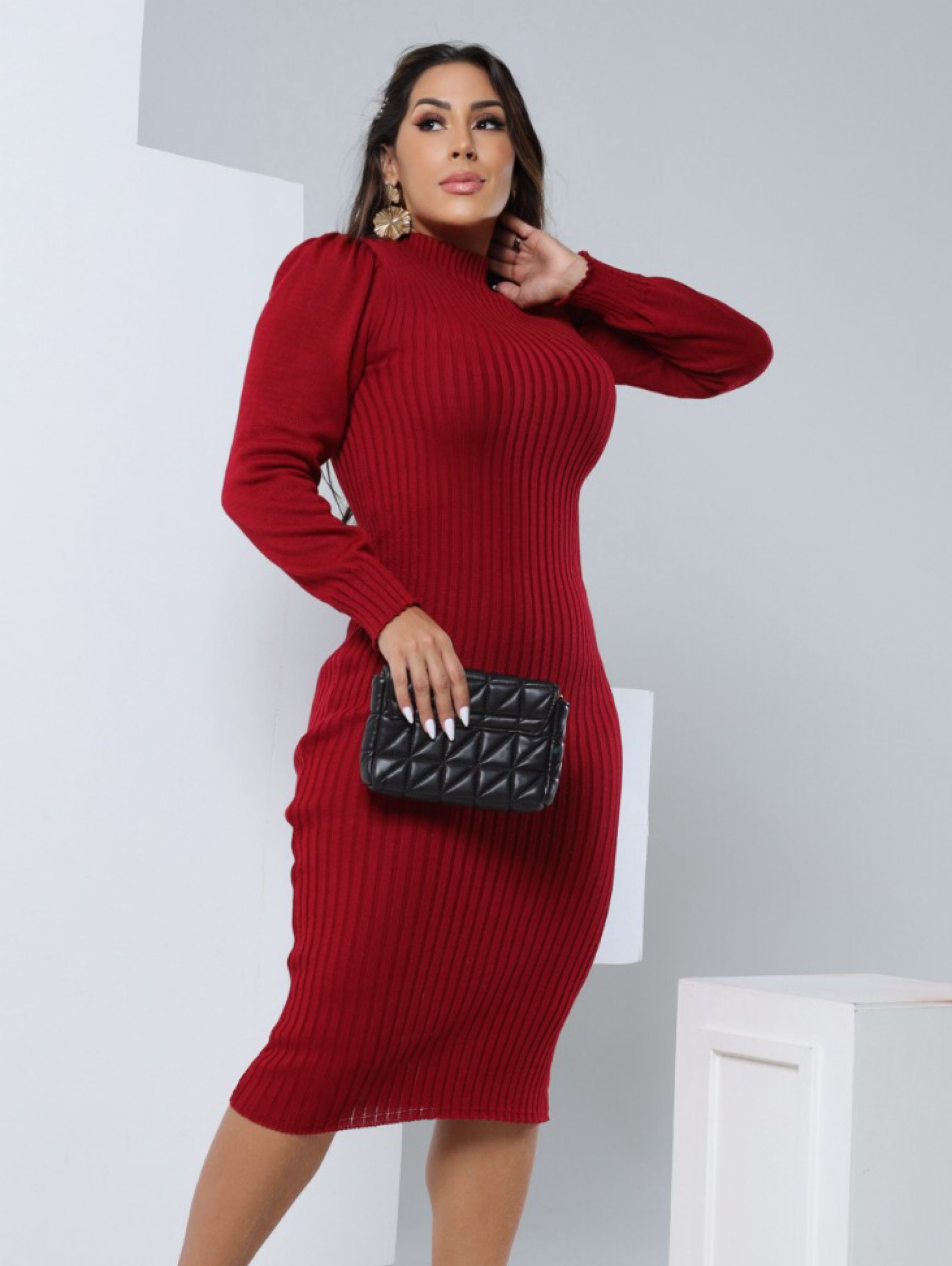 Vestido Tricô Lady Manga Longa Canelado Midi