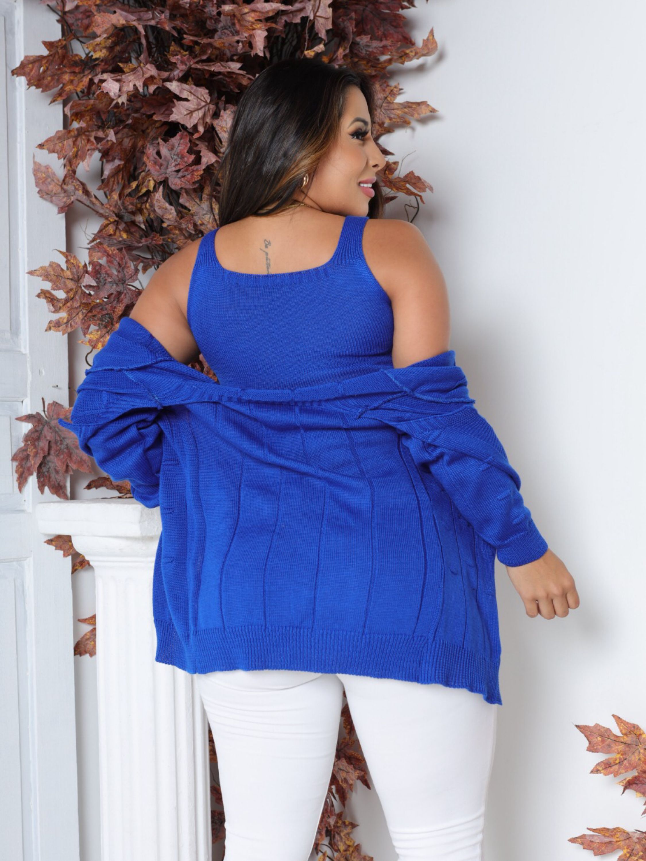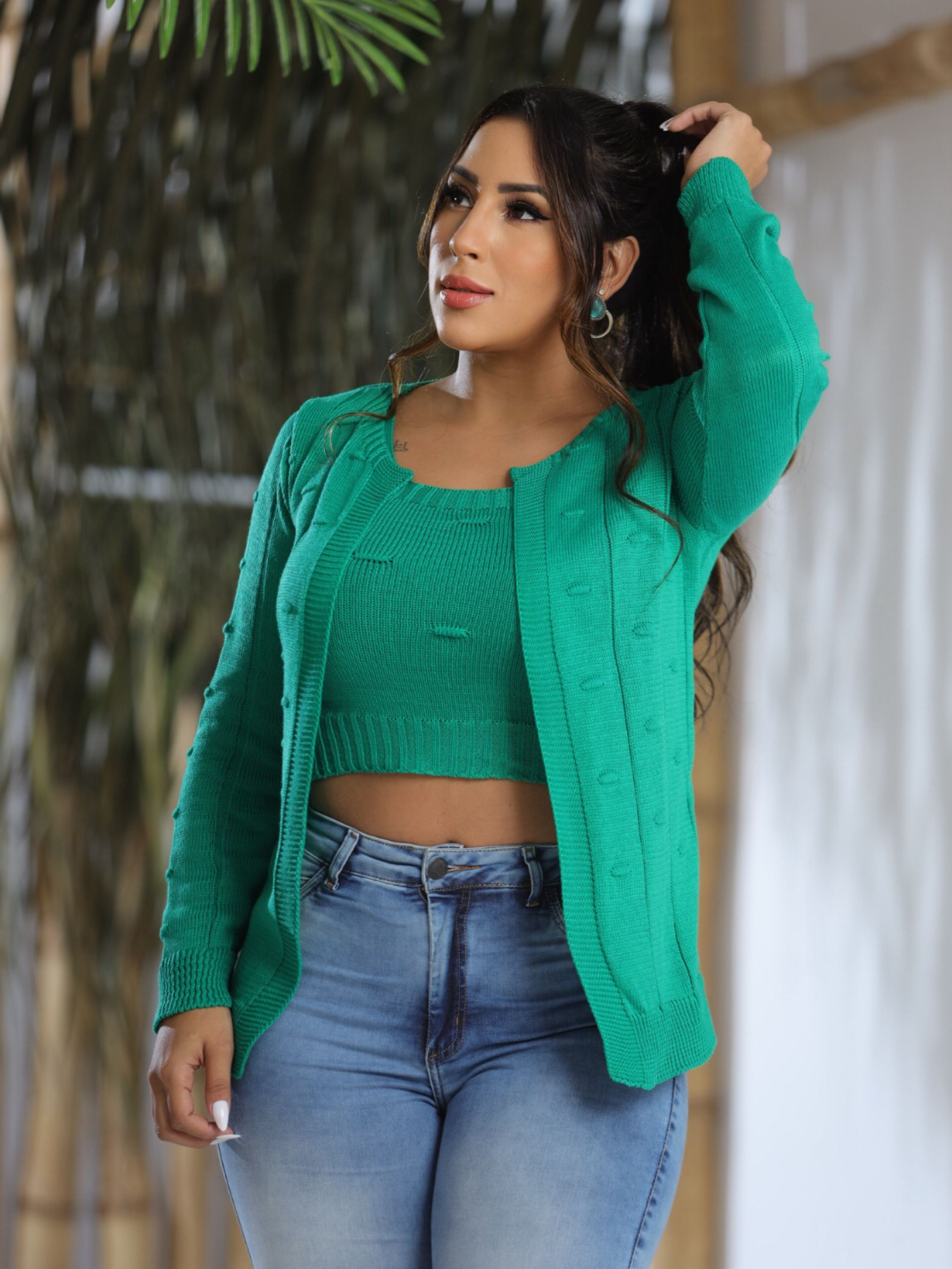 Essa conjunto de tricô é a escolha perfeita para dias com temperaturas mais baixas, ou para dar aquela saidinha a noite com muito estilo. Com um design moderno, prático, e fofo, é confeccionado com materiais leves e macios, proporcionando conforto durante o uso. Sendo um casaquinho e um cropped, permite ajustes ao seu gosto para um caimento perfeito, ou usar só o cropped em dias mais quentes ou só o casaquinho em dias mais frios, enfim, diversas opções de uso oferecendo não apenas praticidade, mas também um toque de estilo único ao seu look. Tamanho único veste 38 ao 44. RECOMENDAÇÃO DE USO: • Usar sabão neutro. • Secar na sombra. • Lavar a mão