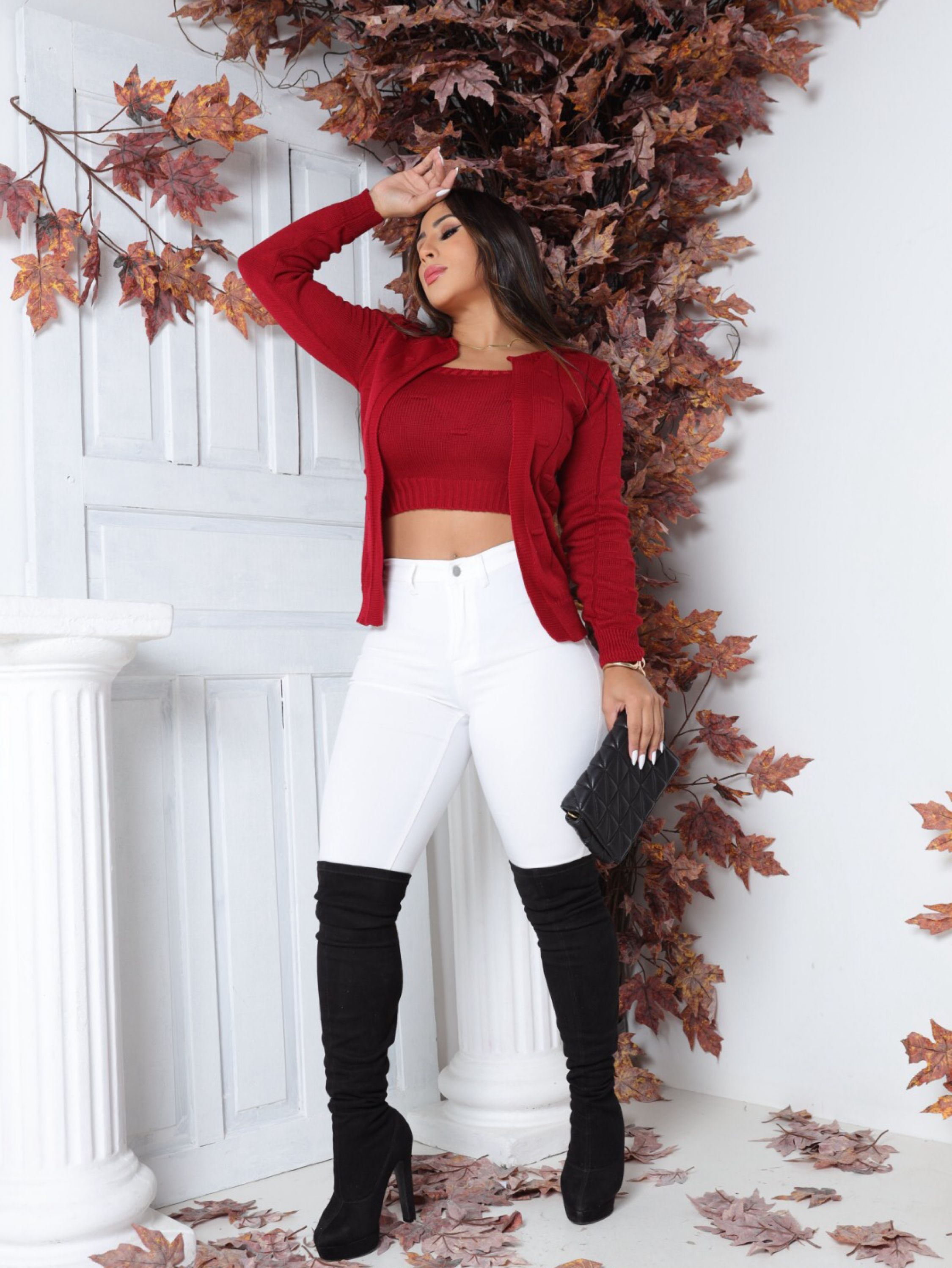 Conjunto Tricô Sophia Twin-set Casaco Manga Longa e Cropped